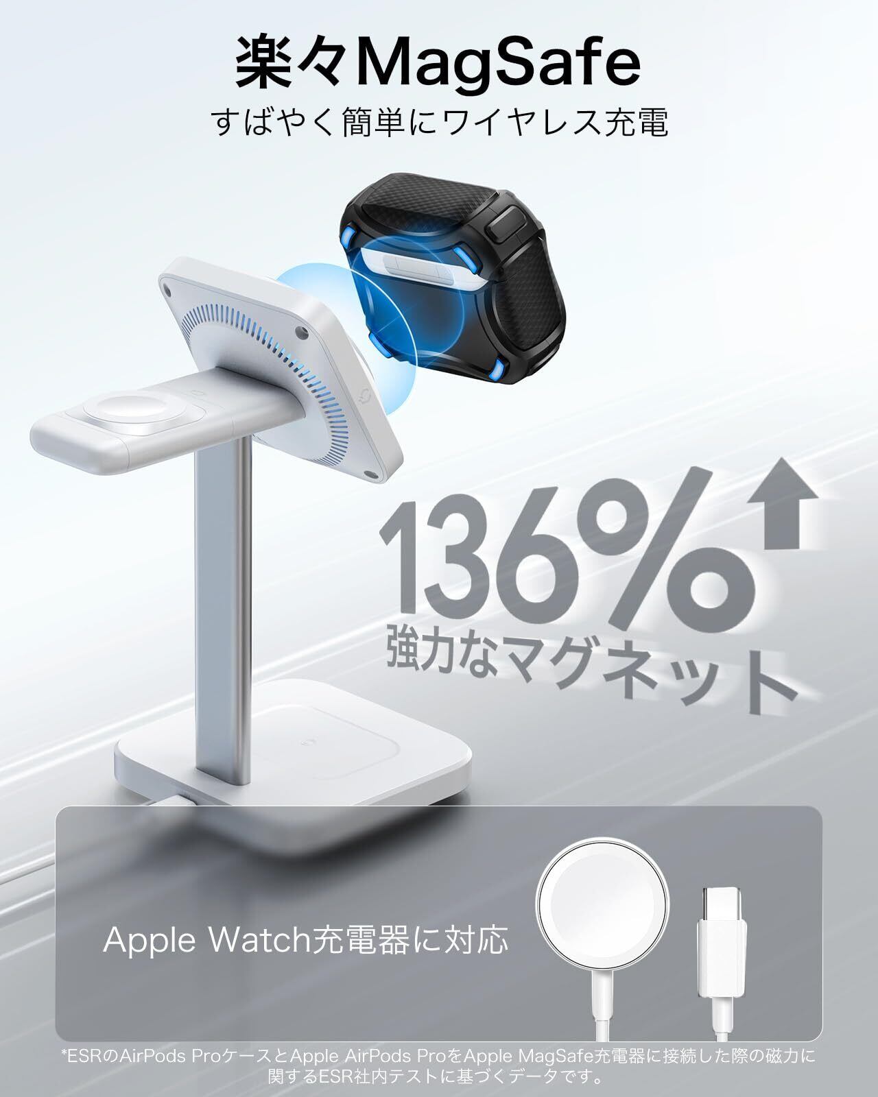 【MagSafe対応】:ケース背面の強力なマグネットがMagSafe充電器を確実に磁気吸着ロックし、瞬間吸着のワイヤレス充電をイヤホンで楽しむことができます。