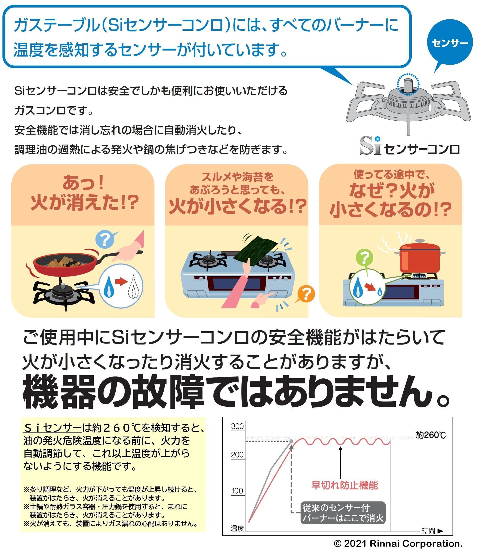 調理油過熱防止機能:この商品には揚げもの油の発火を防ぐため、温度センサーを搭載しています。(ガス事業法により搭載義務あり)(強火力・標準バーナー)