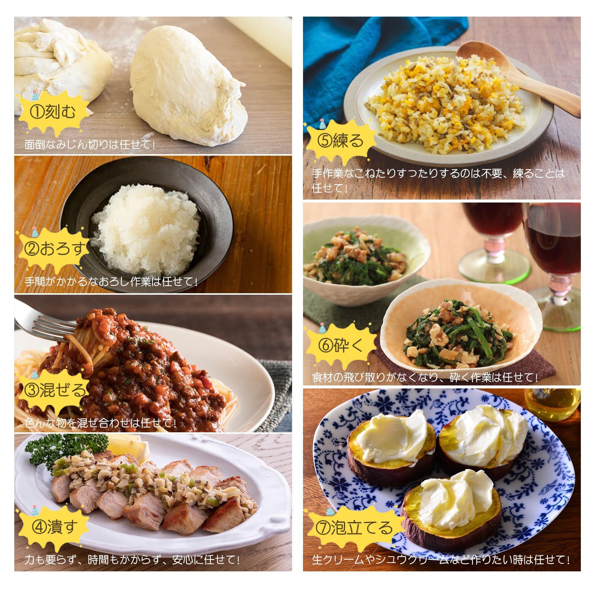【1台7役・料理上手へ】BelleLifeフードプロセッサーで、刻む・混ぜる・練る・潰す・砕く・おろす・泡立て ことが一台で調理できます。コード式・一分間26000回転のパワフルモーターで市販氷も砕ける(4cm程度の氷限定)。柔らかめの食材にも硬めの食材にも対応でき、野菜のみじん切り・生クリーム・離乳食などのような料理が簡単・手軽に作れます。
