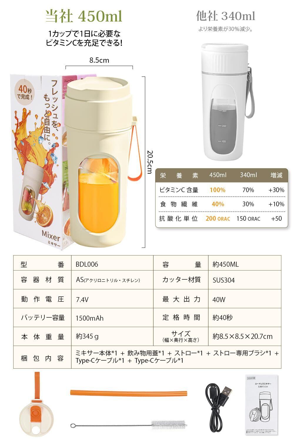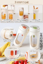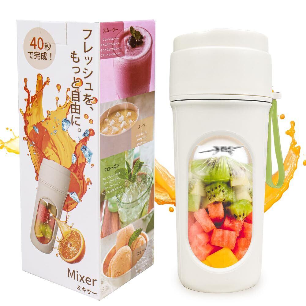 【片手で軽々!夏の暑さを"ワンボタン"でクールダウン】 J.K.T小型ミキサーは、コンパクト設計(片手持ち可能)ながら総容量450mlの大容量(ジュース作りは350ml対応)。超軽量設計(僅345g)で女性も高齢者も楽々操作。猛暑日のベランダ・キャンプ・プールサイドで重宝するポータブル設計。面倒な後片付けは自動洗浄モード(水入れてボタン押すだけ)で行えます。このハンディミキサーは、炎暑の日の外出時や夜の帰宅時に、ボタンひとつでひんやりフレッシュジュースが楽しめる「移動型クールステーション」です。