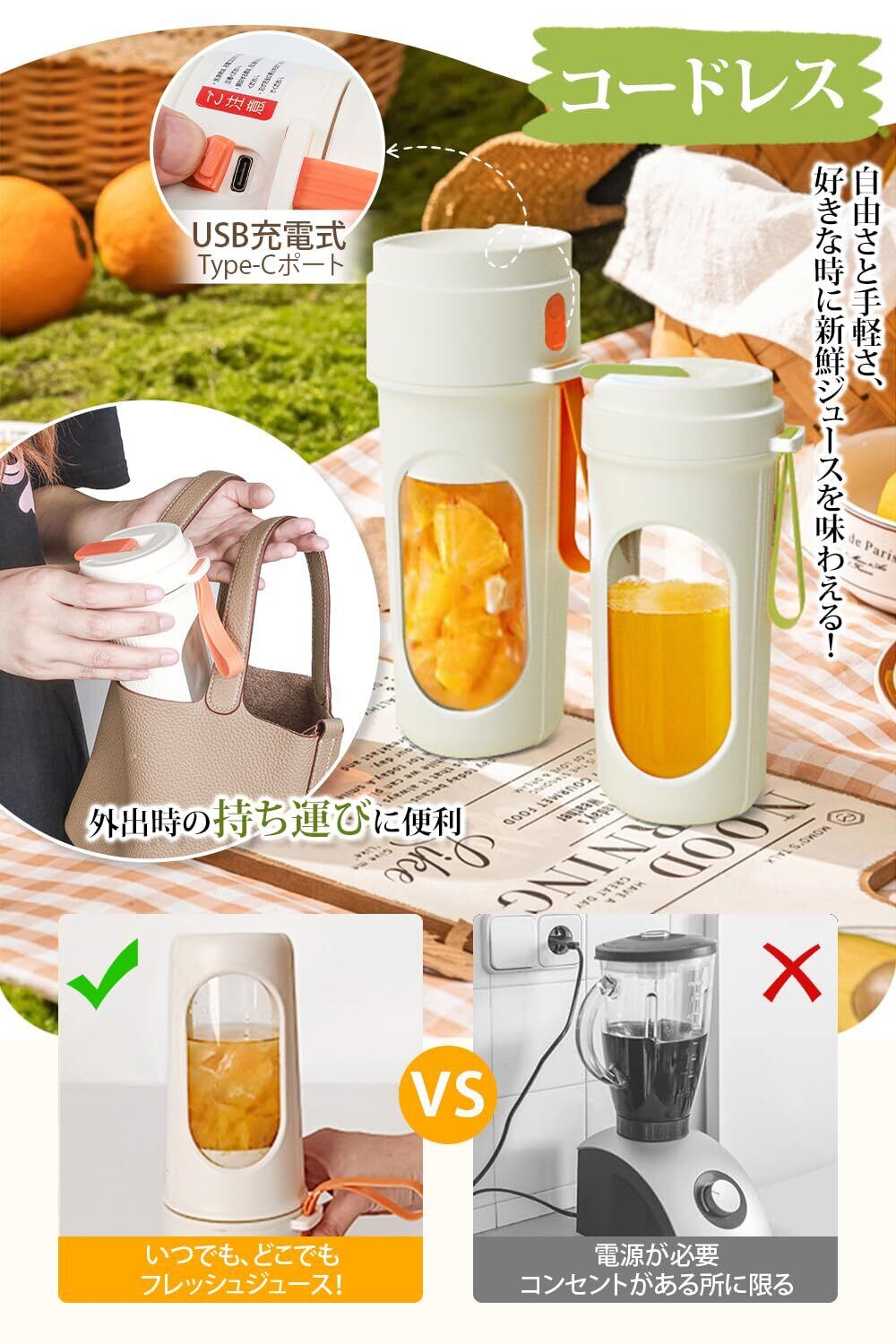 【時短×栄養!毎日の「搾りたて習慣」を40秒で実現】 夏の食欲低下や栄養不足を解消する高速鮮榨ジューサーミキサー。USB充電式でコンセント不要、オフィスデスクやキッチンカウンターで40秒で調理完成。朝の忙しい時間や暑くて料理したくない夜も、果物・野菜をポン投入するだけでビタミン補給が完了。食欲を増進させる2色展開(爽やかミントグリーン/元気サンシャインオレンジ)で、毎日の栄養管理が楽しくなるアイテムです。※初回入荷商品の封印シール破損は説明書に入れたことが原因であり、中古品ではありません!また、今後この現象は発生しません!