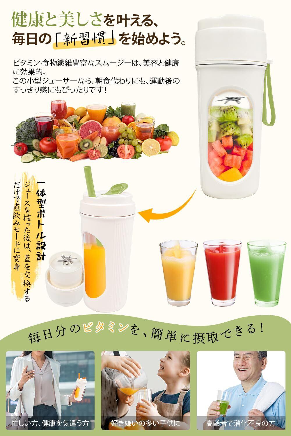 【"一機二役"持ち運べるボトル型ジューサー】 一般のコードレスミキサーと差をつける一体型ボトル設計:搾汁後は蓋を交換するだけで直飲みモードに変身(付属シリコンストロー対応)。運動水筒サイズの広口&完全防漏構造のジュースミキサーでカバンやバッグに入れて通勤中も安心。食品級PP+AS素材(BPAフリー)でレモンなど酸性食材も容器劣化ゼロ。1500mAh容量のバッテリーは最高連続11杯分のパワーを保持、家族みんなの水分補給や2日分の野菜や果物摂取を強力サポート!
