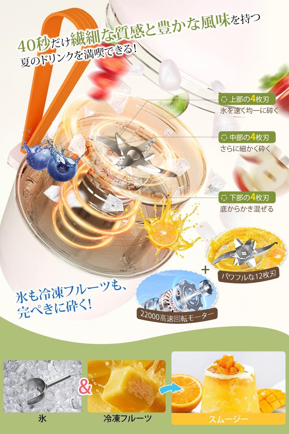 【12枚超硬刃が氷を粉砕!「プロ級滑らか食感」の秘密】 スムージーミキサーの12枚ステンレス刃が固い凍結フルーツや氷を瞬時にサラサラ食感に変える。(氷を砕く際は必ず水を入れ、そうでないとミキサーが動作しません。)繊維質の多い小松菜やセロリもなめらか仕上げで、市販のジュースとは違う本格的な味わいを実現。このミニ電動ミキサーは、3重の安全ロック機能(開蓋即停止/空転5秒自動オフ/誤作動防止)でお子様のいるご家庭でも安心。