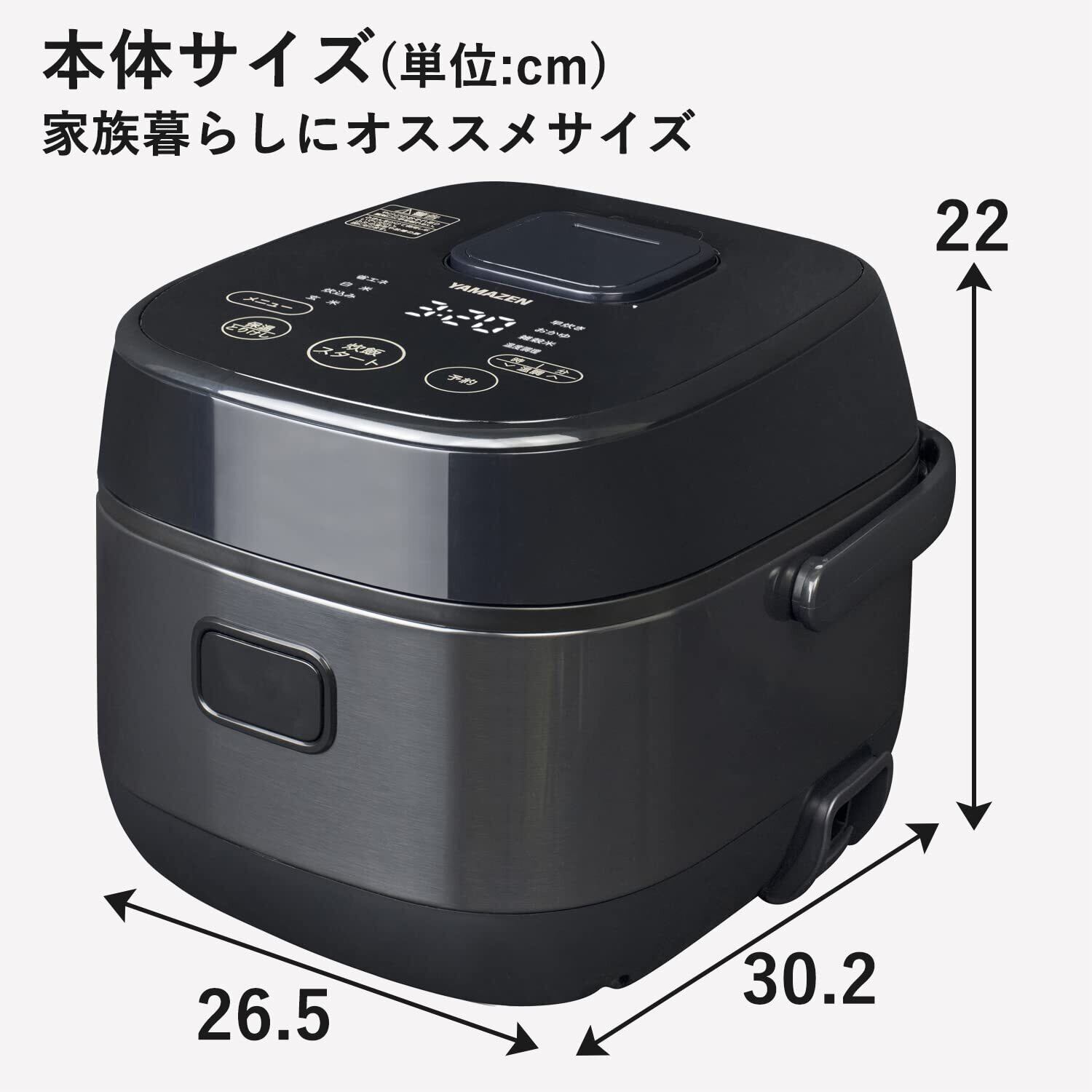 【商品仕様】◇本体サイズ:幅26.5×奥行30.2×高さ22cm ◇本体重量:4.4kg ◇最大炊飯容量(白米):1L(5.5合) ◇電源コードの長さ:1m ◇電源:AC100V(50/60Hz) ◇消費電力:1130W ◇期間:お買い上げ日より1年間。(の範囲については、取扱説明書をご確認ください。(一般家庭用以外(業務用など)に使用された場合の故障及び損傷などは対象外となります))