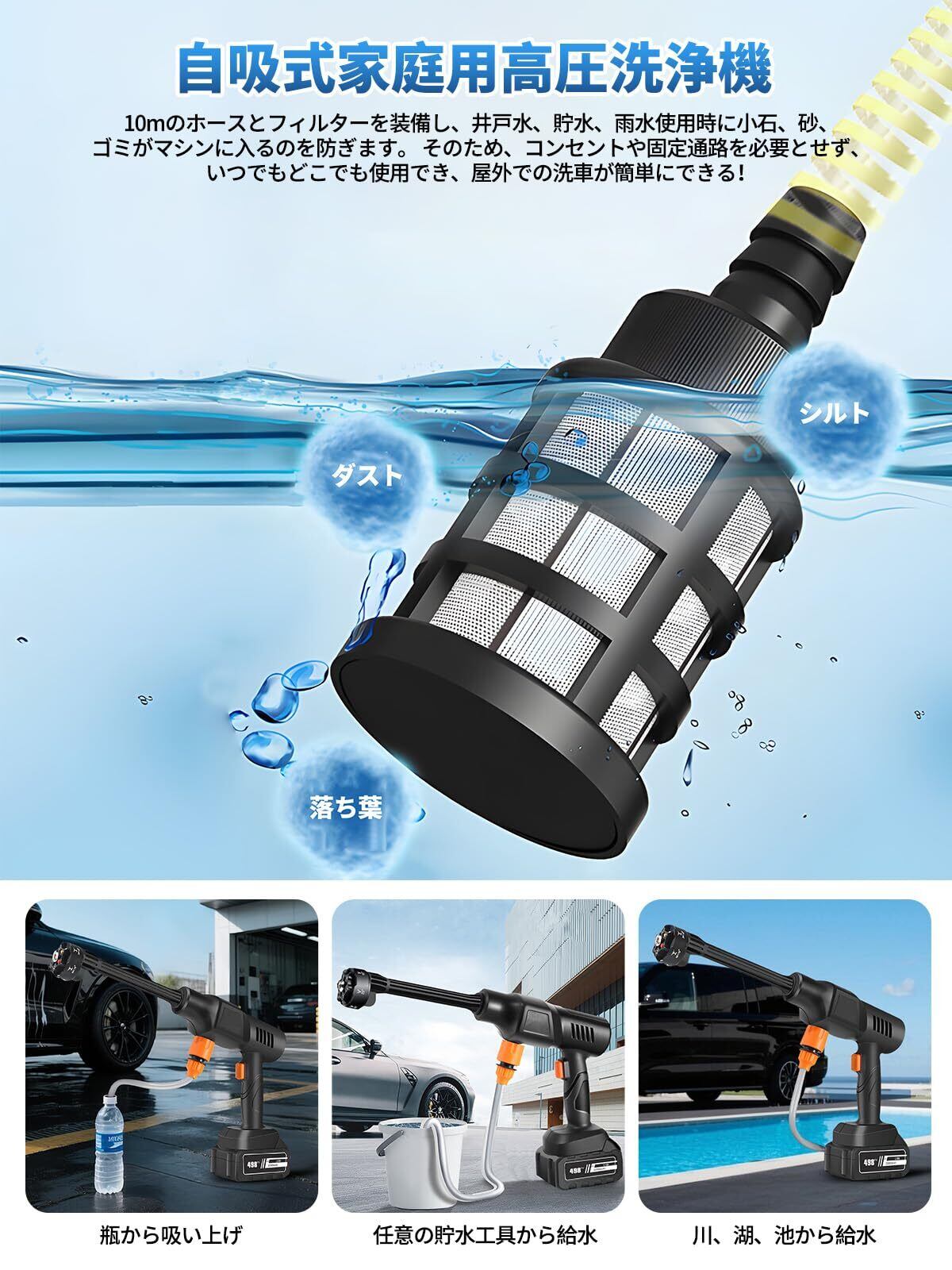 【車洗い専門家監修!節水・省時・アウトドア万能】本高圧洗浄機コードレスは洗車スタッフ監修で使いやすいです。市場で最も長い10mの給水用ホースと加重フィルターを搭載しており、のホースは、粒子や枯れ葉、汚泥などの不純物を効果的にろ過し、バケツ、プール、川など、どんな水源からでも簡単に水を汲み上げることができます。使用水温度範囲は0~40℃で、お風呂の残り湯を使えば水道代を節約できます。これは大量の水と時間を節約することができ、あなたの高圧洗浄機をより良く保護します。アウトドアでの使用に最適な選択肢です。
