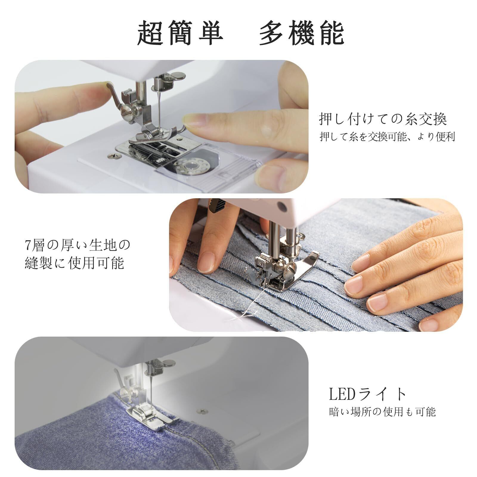 機能部品が揃えています:こちらのミシンは日本語取扱説明書、ポータブル縫製セット82件入り付き、バック縫いとダブルスイッチコントロールなど実用性が高い機能があります。家庭の飾り物、手作り工芸品、ドレス、ペットの洋服、ショッピングバッグなど手作りの初心者と進級者に向いています。