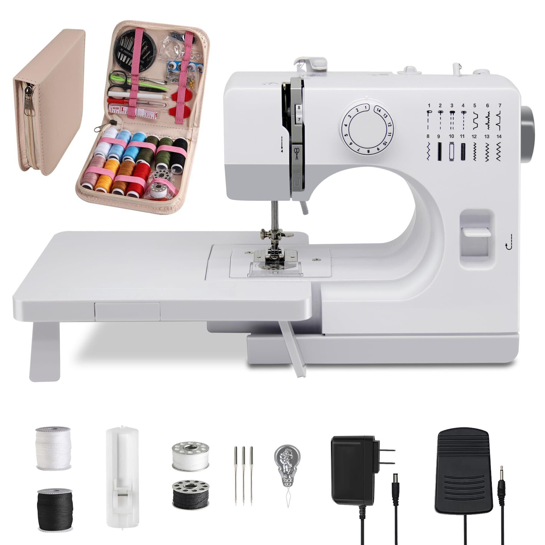 【2025年 最新 初心者向け】電動ミシン ミシン コンパクト 14種類の縫い目 返し縫い機能 日常手作り縫製 裁縫セット付き スピード調整可能 LEDライト 延長台は取付/取外可能 日本語説明書付き ポータブル縫製セット82件入り付き