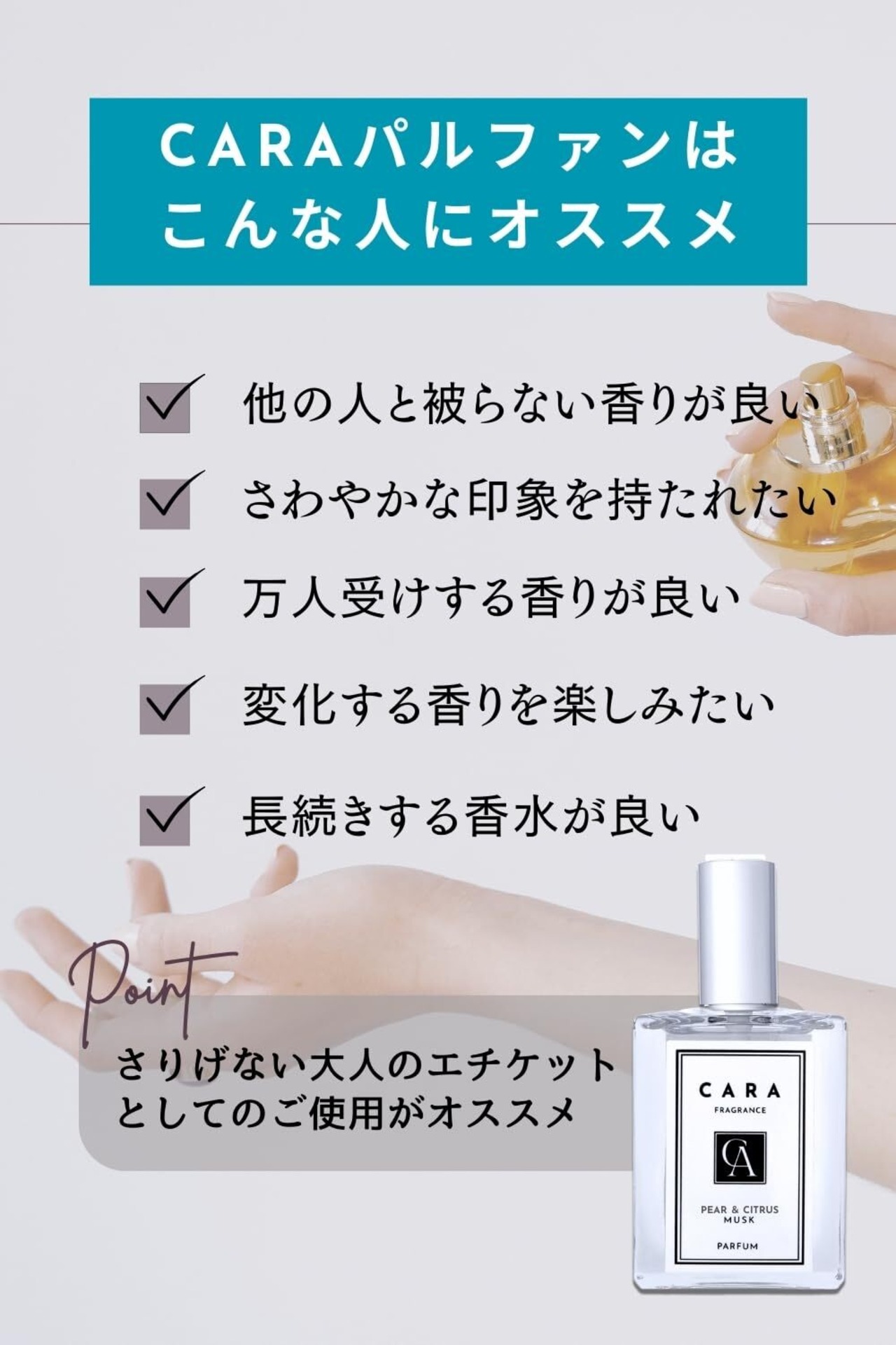 【長く続く さりげない香り】CARAの香水は、香水の中でも最も持続力があるパルファム。石鹸の香りのような爽やかさから さりげないムスクの香りが持続する メンズにも好まれる香水