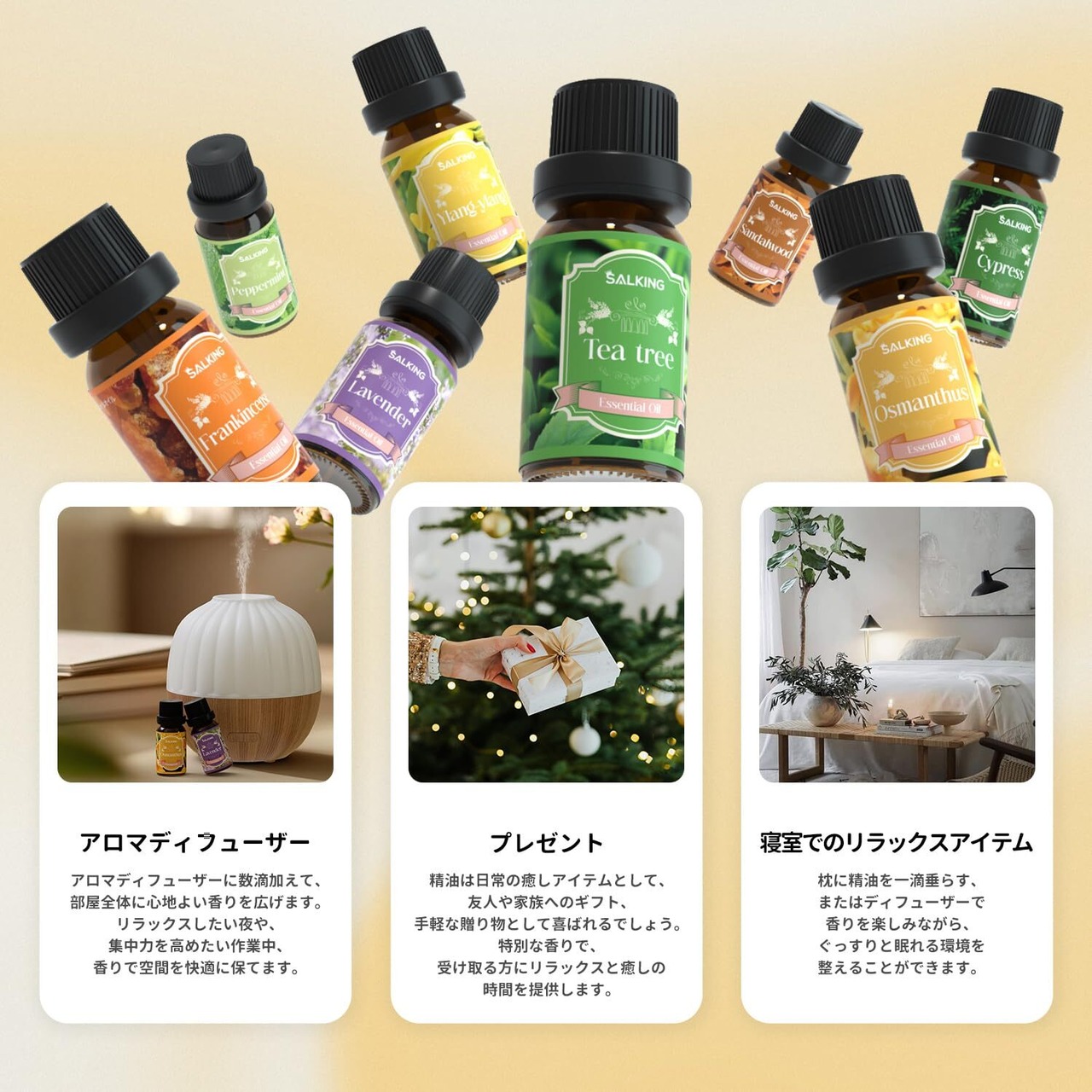 【プレゼントにもぴったりの高品質精油 & 安心のアフターサービス】SALKING 精油は、洗練されたパッケージと高品質な内容で、誕生日や特別な日のギフトにも最適です。大切な人にリラックスと癒しを届けるプレゼントとしてぴったり。また、ご購入後の安心サポートも充実。万が一の不具合や疑問がございましたら、迅速な対応をお約束します。お客様の満足を第一に考えたアフターサービスで、安心してお使いいただけます。