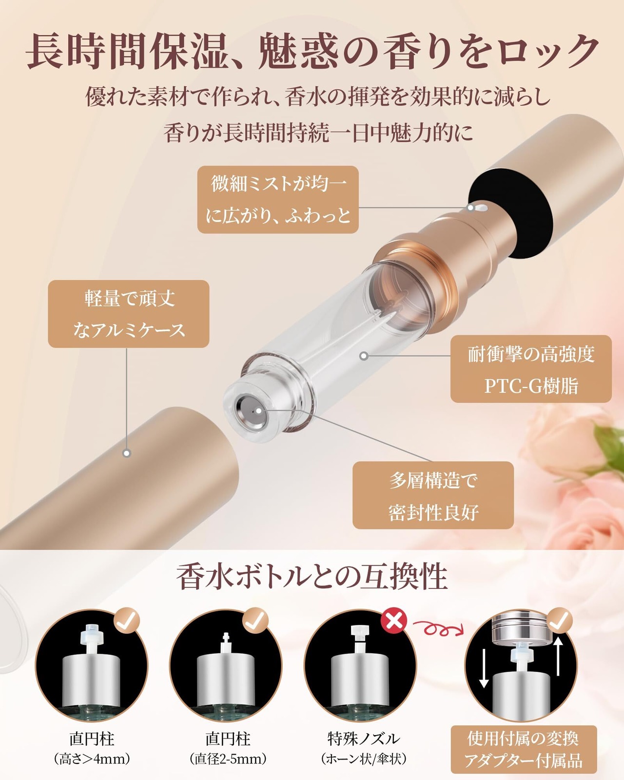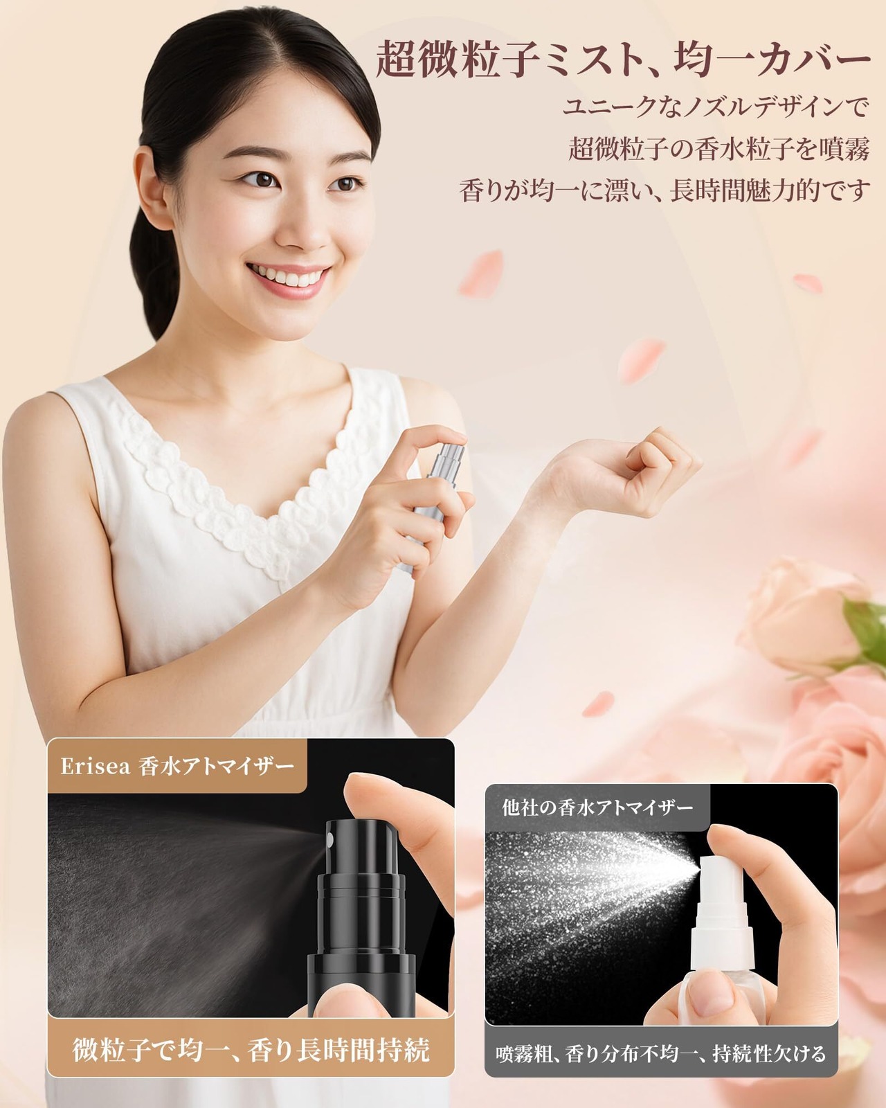 【微粒子ミスト喷霧 】:精密な喷雾ノズル設計、超微粒子のミストが均一に広範囲に散布。少量の香水で大きなカバー範囲を実現し、香水をムダにすることなく、香りを長時間キープできます。香水 ミニボトルとしての実用性を兼ね備えています。