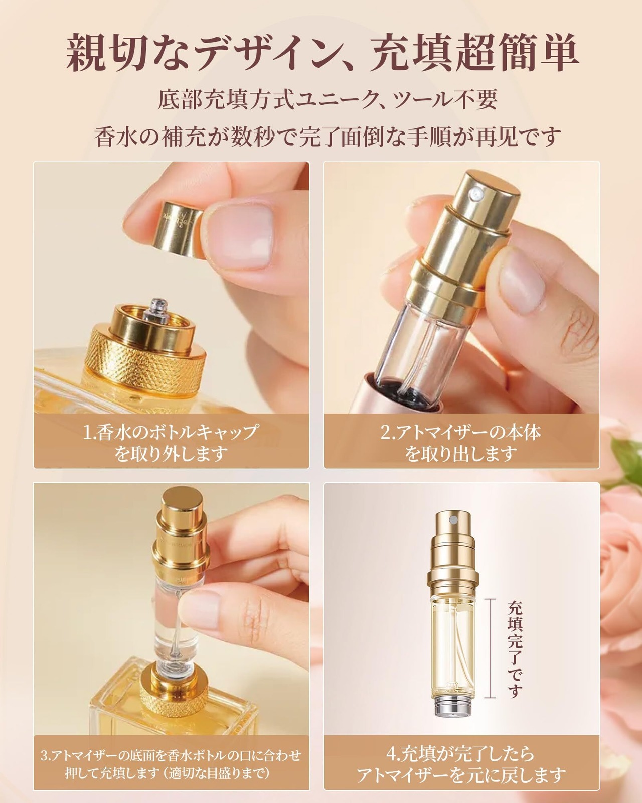 【底部充填設計 】:底部から簡単に充填可能。スプレーヘッドを外し、本製品の底部を押すだけ。約10秒で完了し、手間いらず。充填が簡単で、香水をムダにしません!アトマイザーとしての機能性を最大限に引き出します。