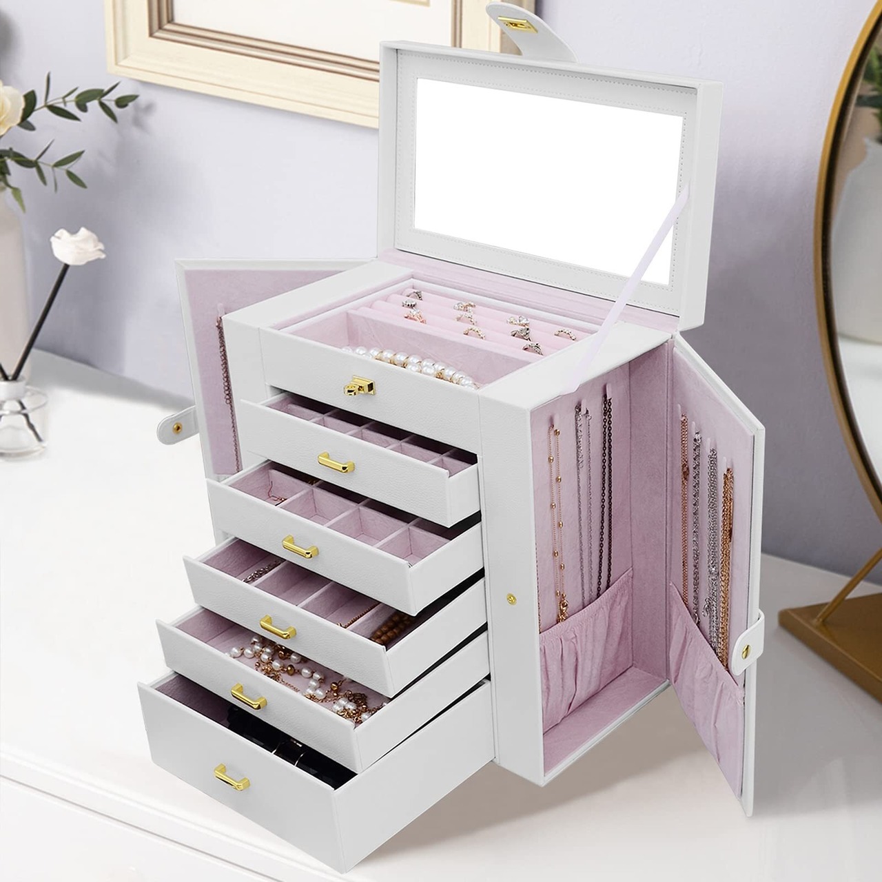 AKOZLIN 大容量 ジュエリーボックス 6段 鏡付き アクセサリーボックス ジュエリー収納 アクセサリー収納ケース ジュエリーケース 5段引き出し 高級宝石箱 XL:30×17×32cm ホワイト