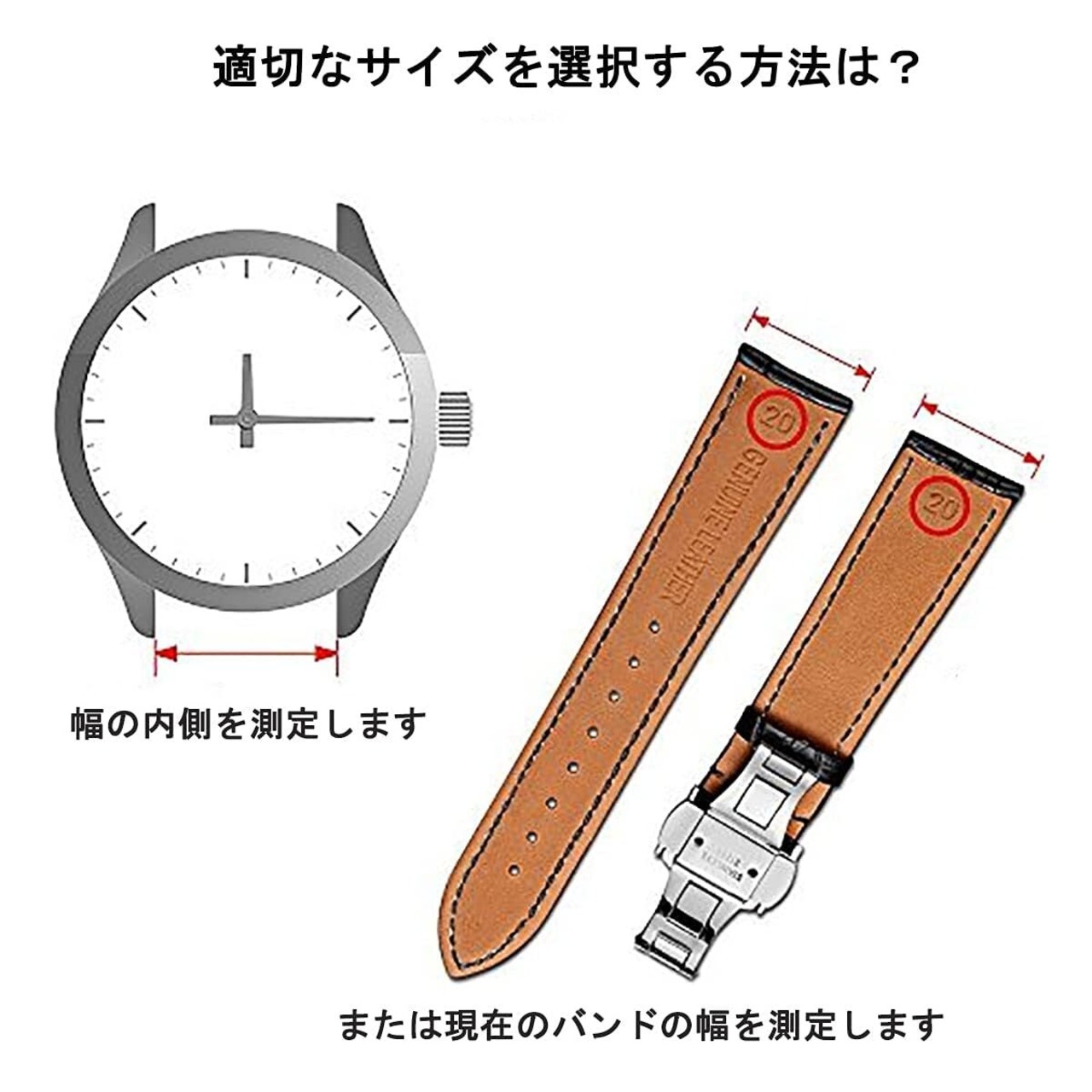 4. 幅の選択:適切な幅を決定するには、バンドが取り付けられているポイントで時計のラグ間の幅を測定するか、メーカーの仕様(通常はオンラインで入手可能)を参照してください。 幅を決定した後、マカレナを行い、測定に対応する幅を選択します。 ご注文の前に慎重に測定してください。