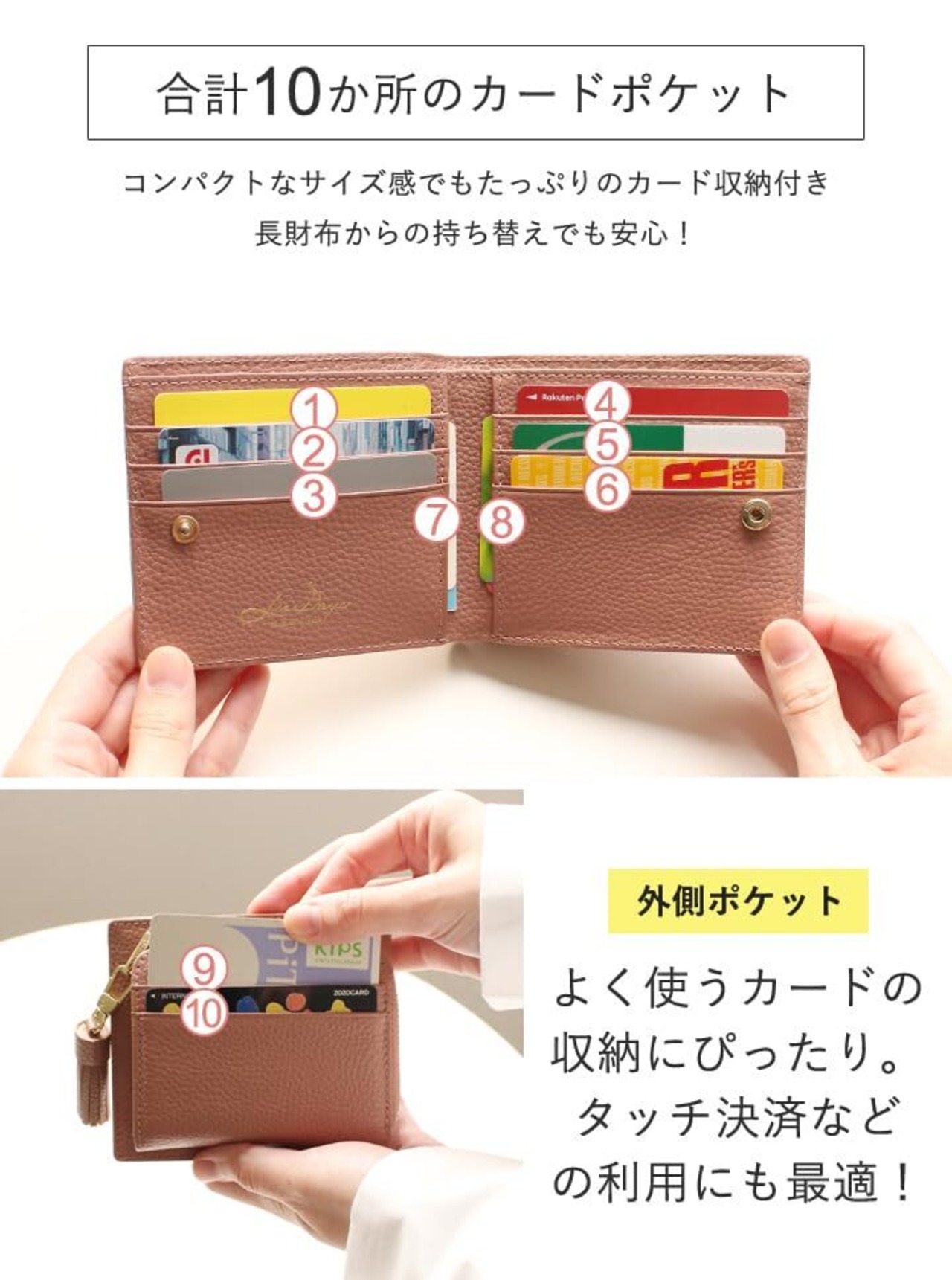 小銭入れ-L字ファスナー 仕様:外側-小銭入れ、カードポケット×2 内側-札入れ×2、カード入れ×8