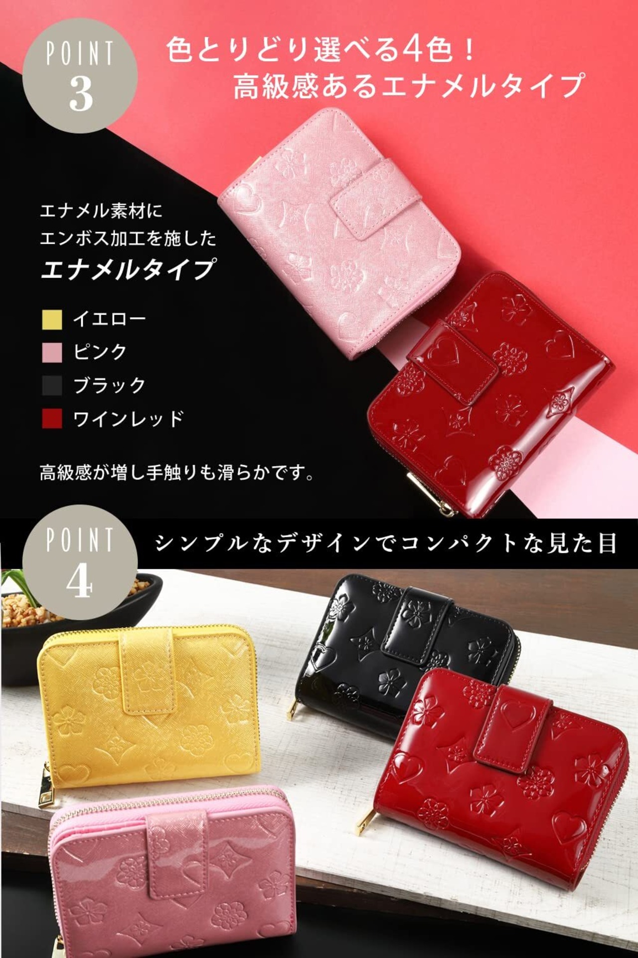 【色とりどり選べる4色!安心の素材は本革】 Kstarplus ミニ財布は、高級本革を使用しています。エナメル素材にエンボス加工を施したエナメルタイプはイエロー、ピンク、ブラック、ワインレッドの選べる4色。高級感が増し手触りも滑らかです。更に本革のマッドブラックを含めて全5色ご用意しています。
