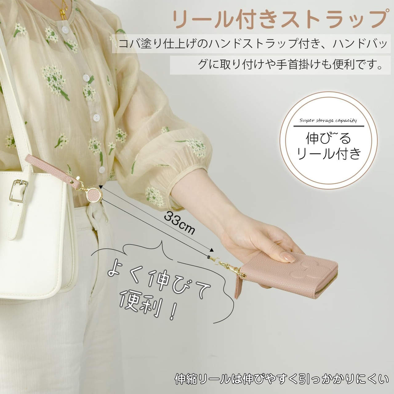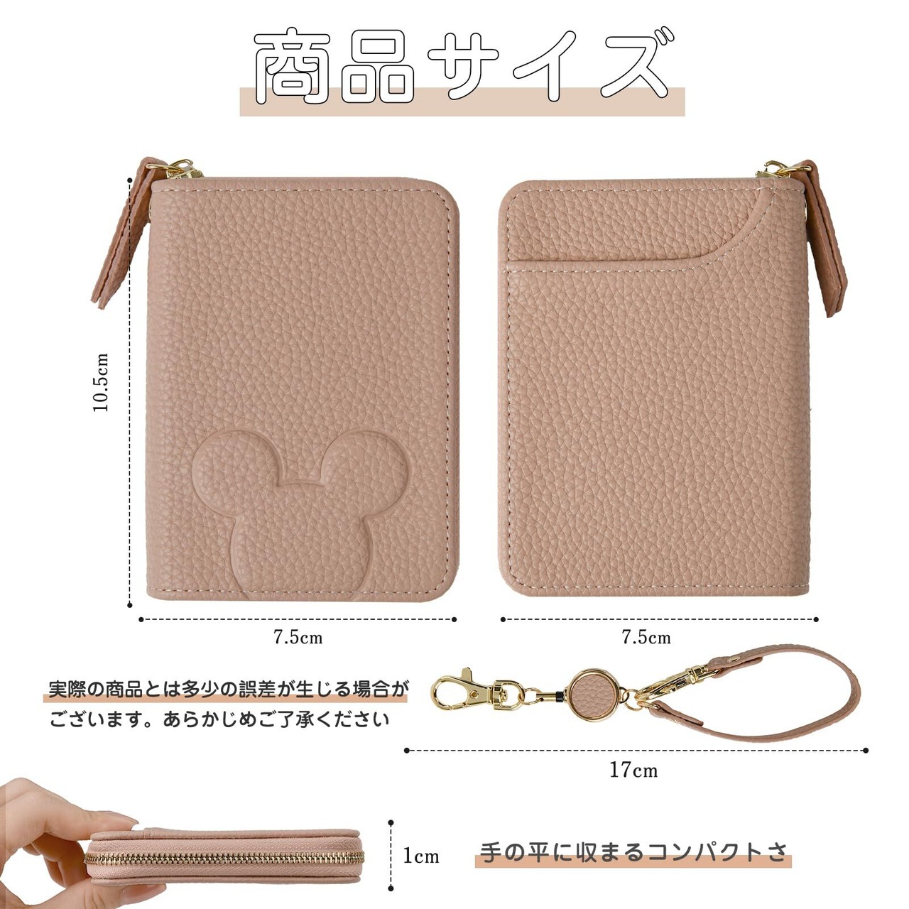【カードポケット&コインケース】カードホルダーは表側に1つ、ファスナーポケットの中には3~8枚のカードが収納でき、ファスナー小銭入れ付きで、紙幣、小銭、鍵などを持ち運べます!ランチやコンビニ、スーパーに行く時に便利です。カードや小銭の取り出しも簡単です!リール付きハンドストラップも付いています!ゴールドカラーの金具が上品でキュートなイメージになります。
