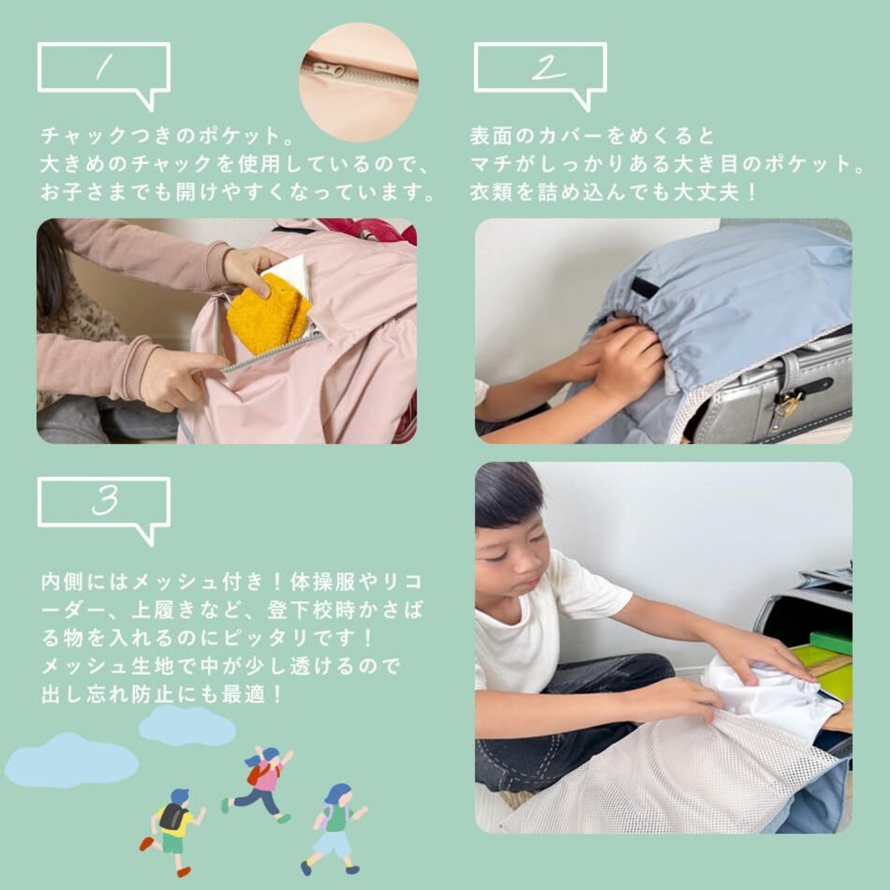 【たっぷり収納付き】表面には大きなポケットとチャック付きのポケット、内側にはメッシュ収納付き!体操服やリコーダー、上履きなど、登下校時かさばる物を入れるのにピッタリです!チャックは大き目のチャックを使用している為、お子さんでも開けやすくなってします!ハンカチやポケットティッシュなど小物を入れるのがオススメ!(内側のメッシュ部分:ランドセルの留め具が入る穴より小さい物を入れるの落ちてしまう為ご注意ください。)