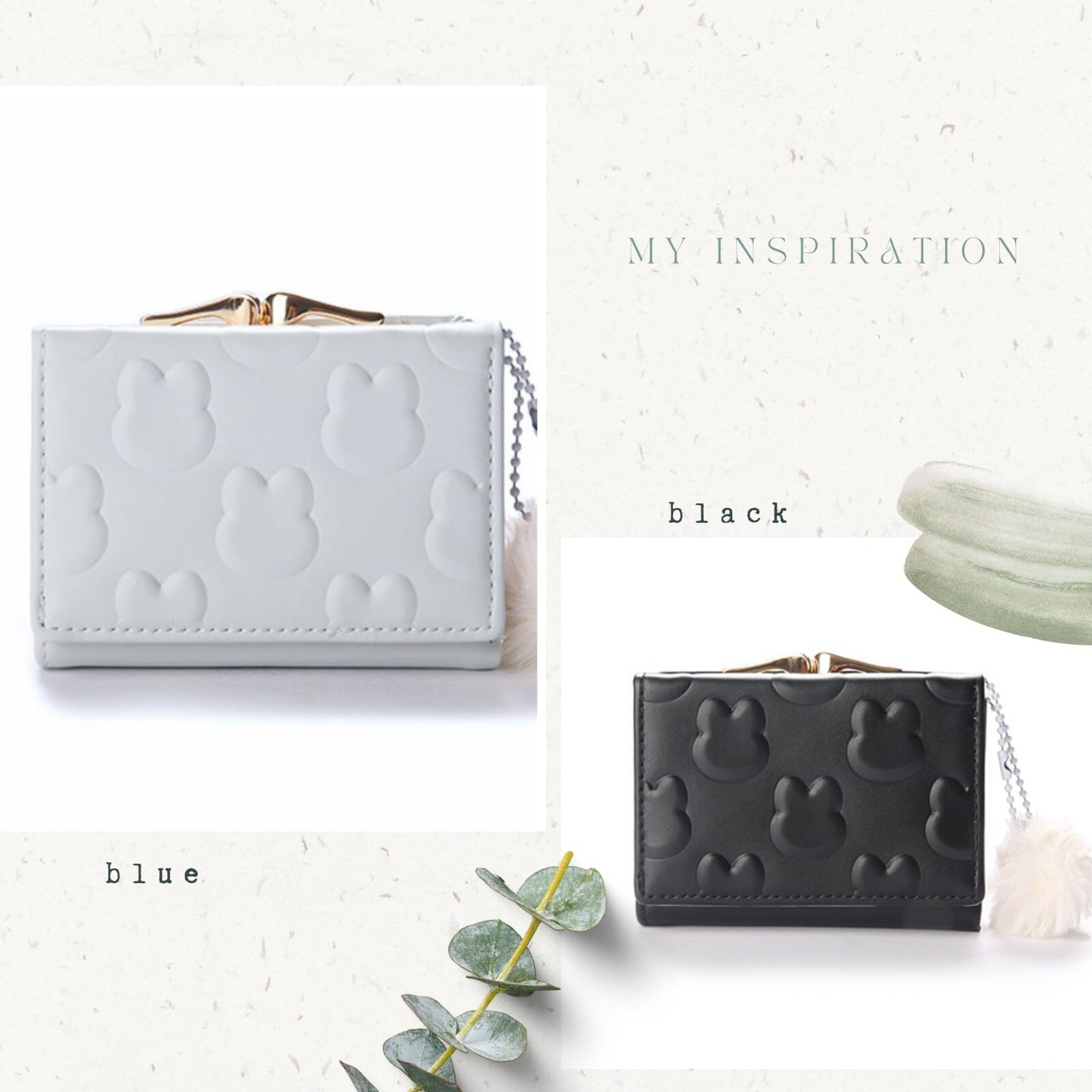 ・かわいいウサギの型押しされた、コンパクトな三つ折り財布です。片手の手のひらに収まる持ちやすい大きさで、お子様にも扱いやすいサイズです。 ・ボタンをはずして中を開けると、カード入れ5か所、フリーポケット2か所、パス入れ1か所、札入れ1か所、そしてがま口の小銭入れが1か所です。がま口の中に仕切りはなく、中の小銭が取り出しやすくなっています。 ・ウサギのしっぽのような丸いモフモフのチャームがポイント!パステルカラーの色味とマッチして可愛さ満点。 ・優しいパステルカラーとアイコンのようなウサギ模様がとってもキュート。ママさんやOLさんからキッズやジュニアにも幅広iい年齢層にお使いいただけます。プレゼントにすると大変喜んでいただけることでしょう。 ・サイズ:10.5*8*3cm