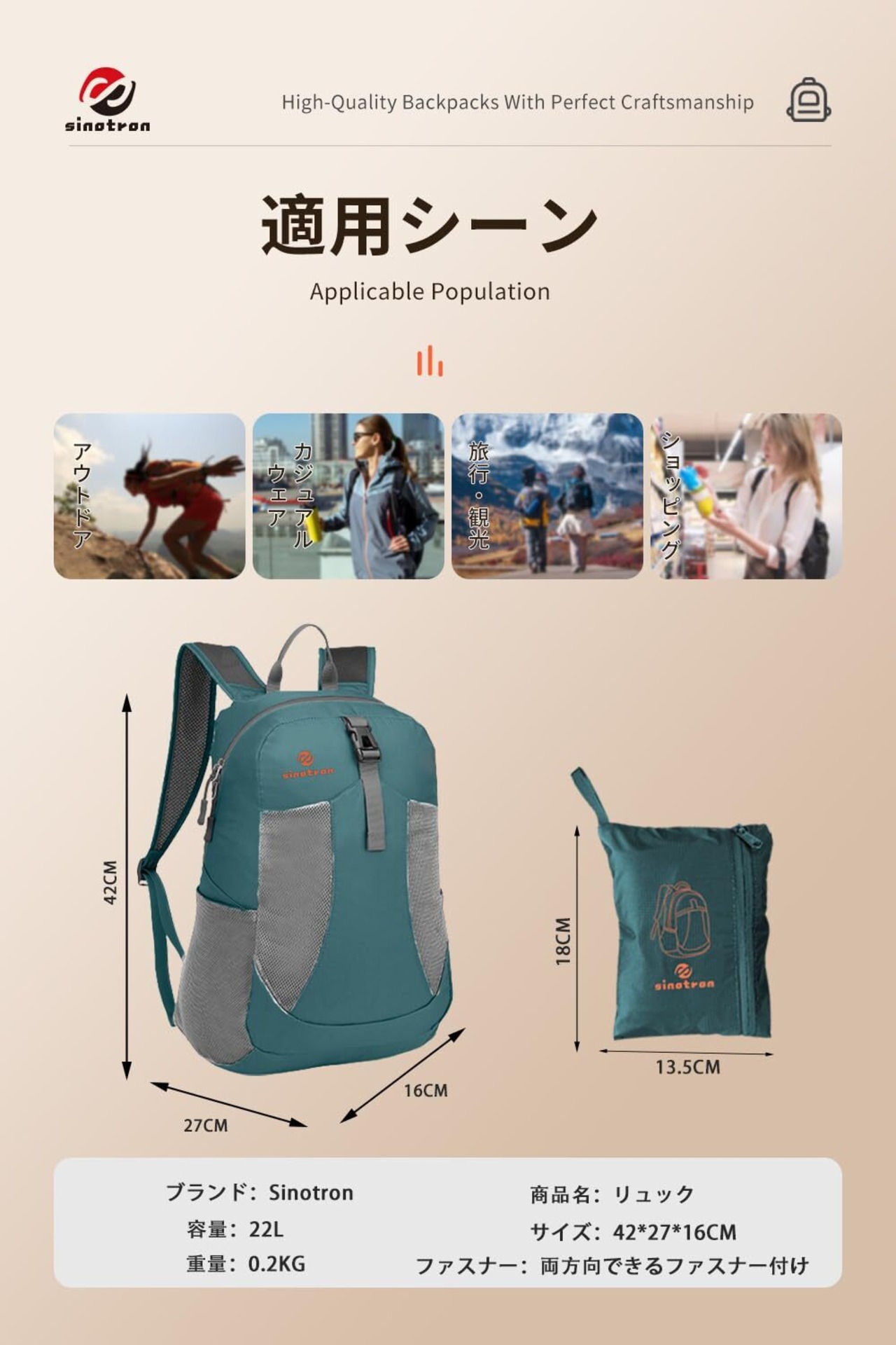 【22L大容量】ポケッタブルリュックは22L大容量仕様、 メインポケットは、必要なものが 収納できる大きさには十分です。更に折りたたみ式なので、出張や旅行での長い旅に最適です。 日記やタオルやビールといった小物から、ペットボトル、タブレット、ノートパソコン、 着替え衣装まですっきり収納でき、荷物に応じて使い分けることができます。 【優れた耐引裂性】厚めの撥水ナイロン生地を使用、更に二重底部設計を採用し、 外表は傷がつきにくく、丈夫で質感も耐久性も兼ね備えています。水や汚れがつきにくくて、 また、どちらの側からでも簡単に操作できるように、バックパックには、防水性と防塵性を備 えた頑丈なSBS金属製ファスナーが2つあり、どちらの側からでも簡単に操作できます。 【軽量、折り畳み可能】僅か0.2kgなデイパックです。手のひらほどのサイズの小さなバッ グに折りたたんで、パックについたファスナーを閉じて、どこにおいても大丈夫、本当の意味 で省スペースな一品です。. 旅行するときは大きなスーツケースに入れることができて、持ち運 ぶことが便利です。さらに、空港で、重量超過料金を避けるために、リュックを展開して、重過 ぎる荷物を持ち歩くことができます。旅のたびに必ずアイテム! 【幅広い適用性】Sinotron折りたたみバックパックは、軽量で耐久性のある高品質の製品です。 ハイキング、キャンプ、旅行、学校に適しています。防災バッグとしても便利です。 男性、女性、旅行愛好家への素晴らしい贈り物です。 【良い通気性】メッシュ性のショルダーストラップには十分なパッドが詰められており、 肩の負担を軽減し、負担をかけることはなく、長時間使用しても疲れません。歩行を快適 にしてくれて、いささかも不快感を与えません。