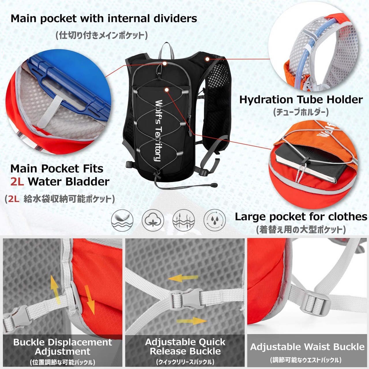 【体にフィット】腰部の伸縮ベルトと胸元の調節クリップが調節可能で、個人の体型に合わせてを調整いただけ、フィット感が高いです。走動中のバッグのズレを効果的に防ぎ、身体への負担を分散して、ストレスなく走り続けられます