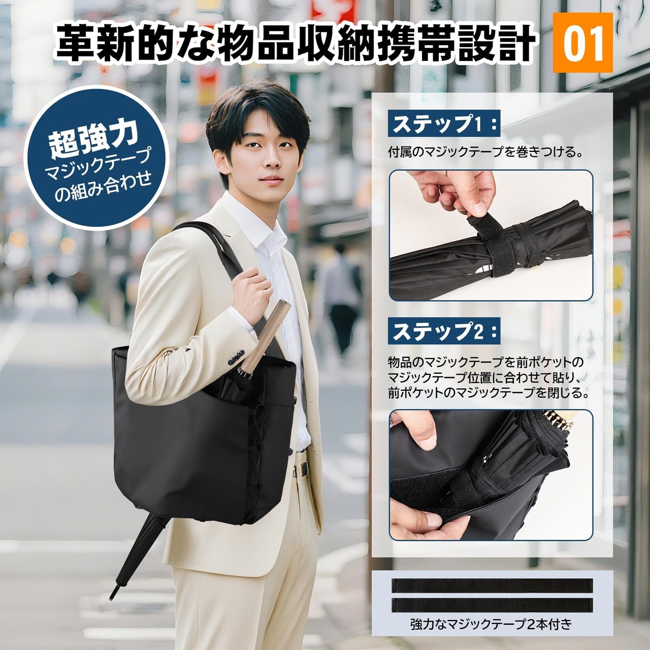 【革新的なフロントポケット設計で、傘や自転車ヘルメットなどの大きな荷物もラクラク収納!】YAPOTO トートバッグ だけの独自フロントポケットデザイン。 1️⃣ 長物収納:付属の2本の面ファスナーストラップを傘などの長物に巻き付け、ポケット内側の対応位置にしっかり固定。移動中でも安定して持ち運べます。 2️⃣ 長物以外の収納:自転車ヘルメット・7号バスケットボール・5号サッカーボールもそのまま収納可能。アジャスター付きストラップを締めれば、しっかり固定できます。
