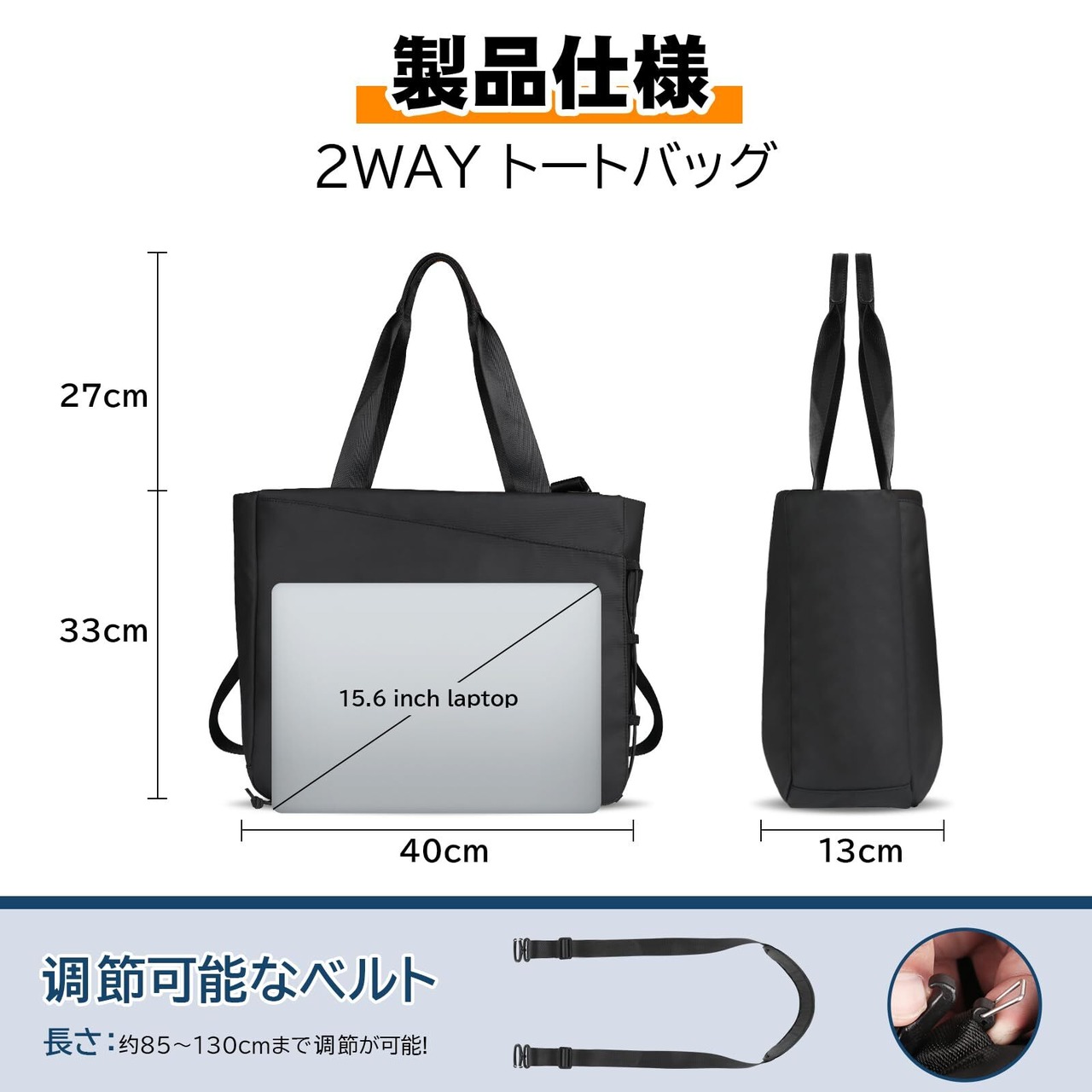 【YAPOTO ビジネストートバッグ 仕様詳細】 素材:ナイロン防水素材(表面)、ポリエステル(裏地)、PUレザー(持ち手) サイズ:約H33cm × W40cm × D13cm 持ち手長さ:約27cm 重量:約800g ベルト長さ:約85〜130cmまで調節可能。 【YAPOTO 品質】ご購入から90日以内に初期不良があった場合、無料で交換対応いたします。その他不明点やお困りごとは、いつでもお気軽にお問い合わせください。