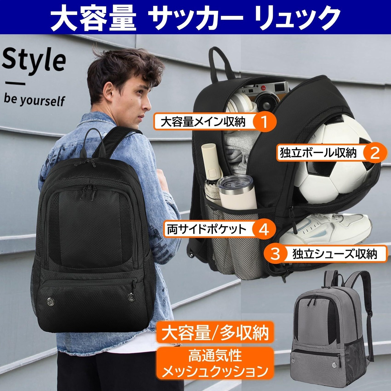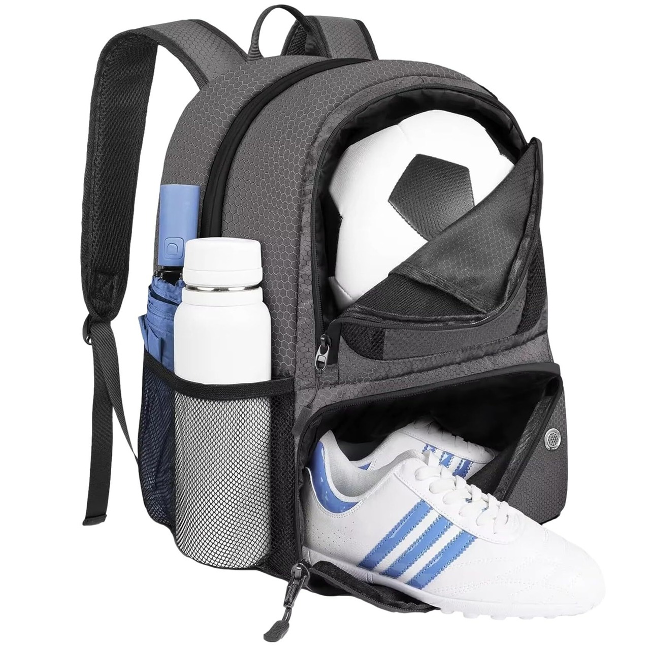 サッカーボール、スパイクやシューズを独立収納できる多機能大容量リュック。単独でシューズを収納できますので、他のアイテムを汚すことがありません。4つの収納 ①メイン収納 ②独立ボール収納 ③独立シューズ収納 ④両サイドポケット。高防滴性、撥水性で雨水などの水分を内部に通しにくい仕様となっています。背面は通気性、衝撃吸収性に優れたハニカムメッシュクッションパッドを使用しています。ハニカムメッシュはハチの巣構造で肌との接触面が少なく、蒸れにくい素材です。