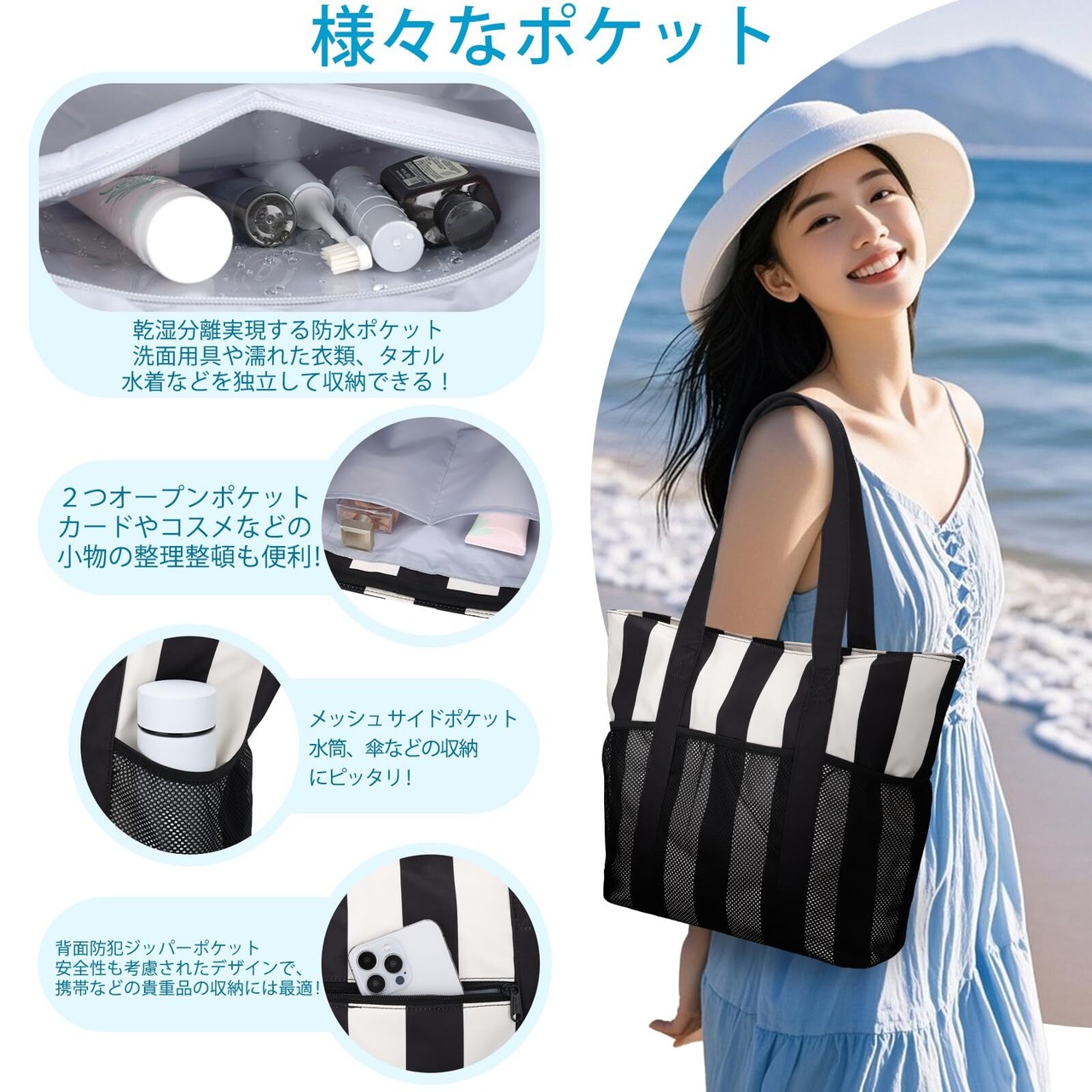 【ストライプ設計&防水素材】VASCHY・旅行トートバッグは丈夫なポリエステルで作られており、防水性に優れていて、ビーチバッグの中身をしっかり守ってくれ、雨の日でも安心してお使いいただけます。ユニークなデザインを採用し、存在感を出しつつ、スタイリッシュに仕上がります。