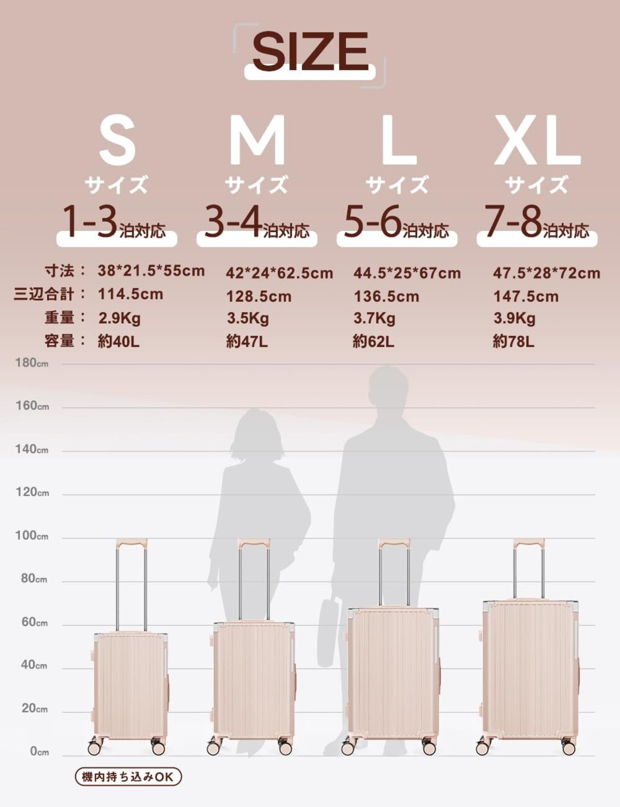 【耐久性抜群・耐衝撃コーナープロテクト】このスーツケースは、ABS 樹脂と PC(ポリカーボネート)混合素材を使用して製造されています。三層構造の素材は、重量を軽減しつつも、強力な耐久性を提供し、旅行中のさまざまな衝撃から荷物をしっかりと保護します。さらに、キャリーケースの四隅には耐衝撃コーナープロテクトが装備されており、ケース全体の耐久性を向上させ、衝撃からしっかりと守ります。S サイズ:38×21.5×55cm、三辺合計:114.5cm、機内持ち込み可、容量は 40L、重量は約 2.9kg です。1 泊 2 日から 2 泊 3 日の旅行や出張の方に対応!小型、軽量で、女性でも楽々に持ち出かける人気なキャリーバッグです。