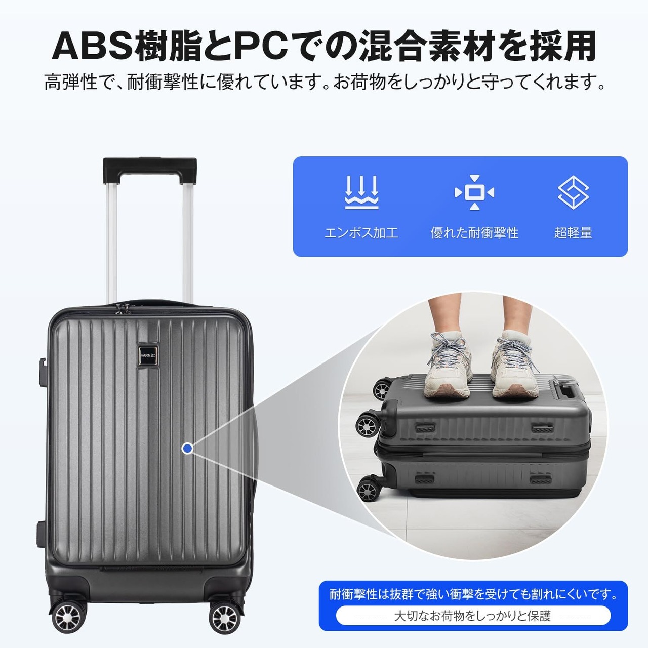 【高品質素材採用】フロントオープン スーツケースはABS樹脂とPC混合素材を採用されており、軽量で耐圧性、耐久性に優れ、大切なお荷物をしっかりと守ってくれます。三段階調節なアルミ合金制キャリーバーはスムーズに伸縮でき、さまざまな体格の方に合わせて調整可能です。長旅や出張にも最適です。