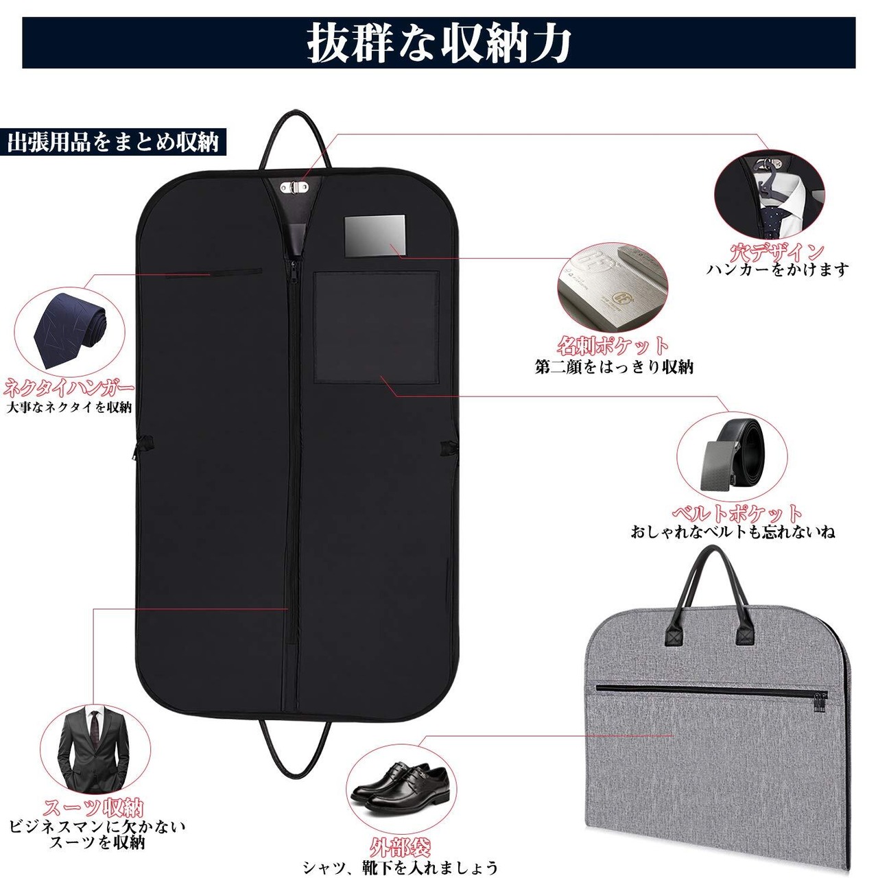 【デザイン】①疲れにくい強化ナイロンハンドルを採用。布を重ねて縫うことによりハンドル周りが補強。 ②両サイドにも開閉ファスナー。 ③スーツが取り出しやすい前開きタイプ。 ④名札を入れられるポケット付き。 ⑤ネクタイを2本分収納可能。 ⑥フロント部分は、小物などを収納できるポケット付き。