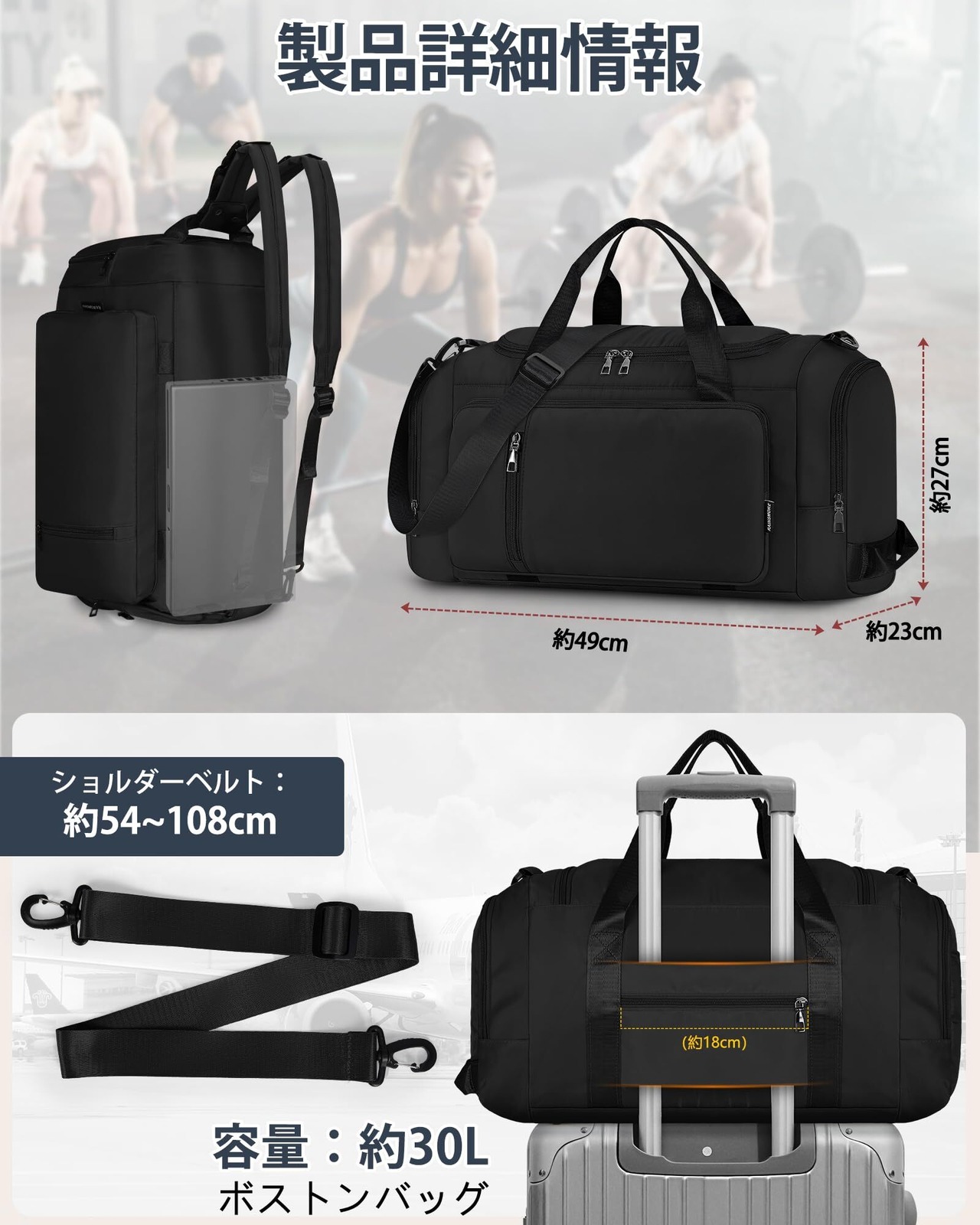 ボストンバッグ 修学 大容量 30L 旅行バッグ レディース 撥水加工 1泊2日 4WAY ジムバッグ メンズ ショルダー 靴収納 乾湿分離 軽量 ベルト取り外し可能 スポーツ ブラック