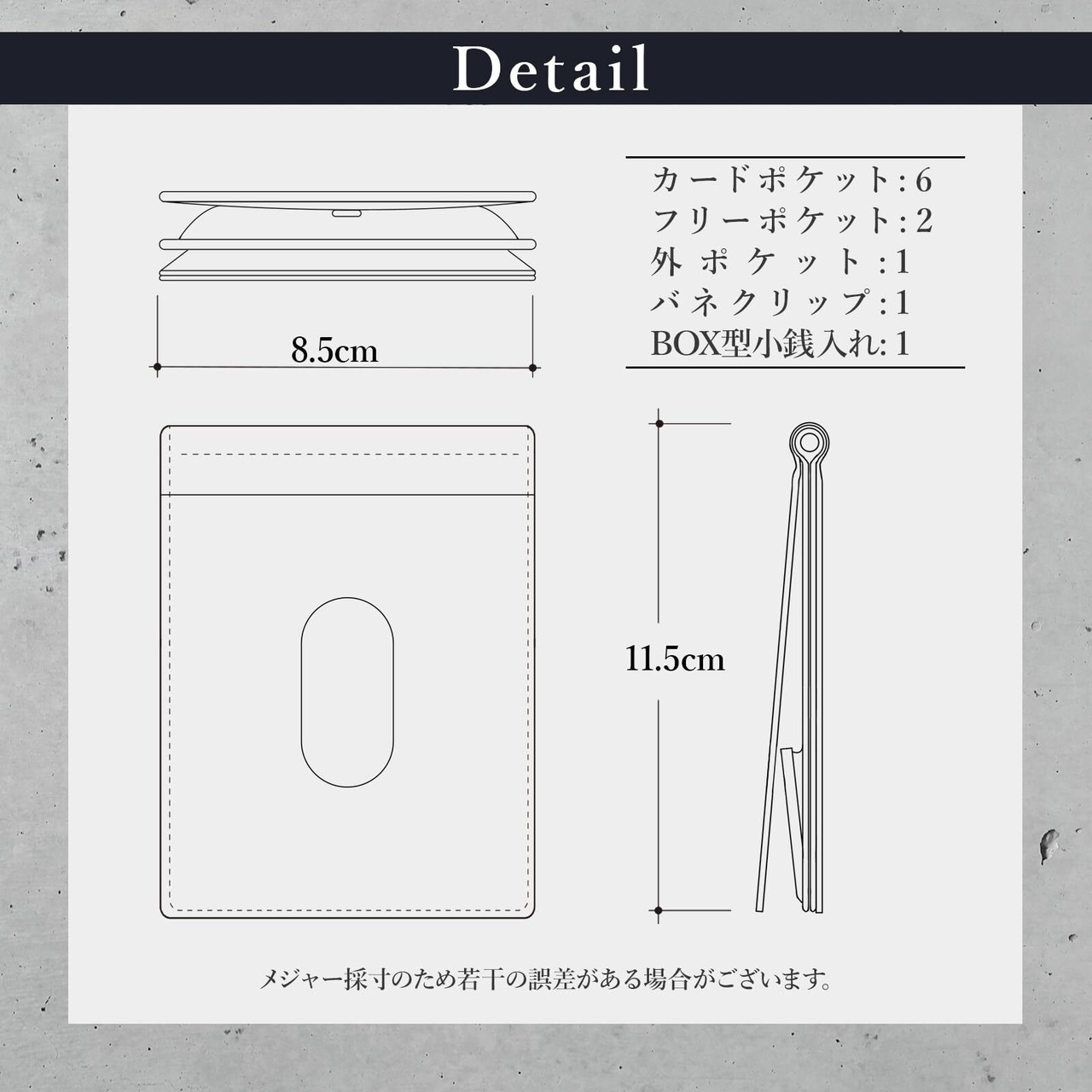 仕様:カード入れ x 7、フリーポケット x 2、札クリップ x 1、BOX型小銭入れ 素材:高級本革(牛)、サイズ:約 横11.5cm x 縦8.5cm
