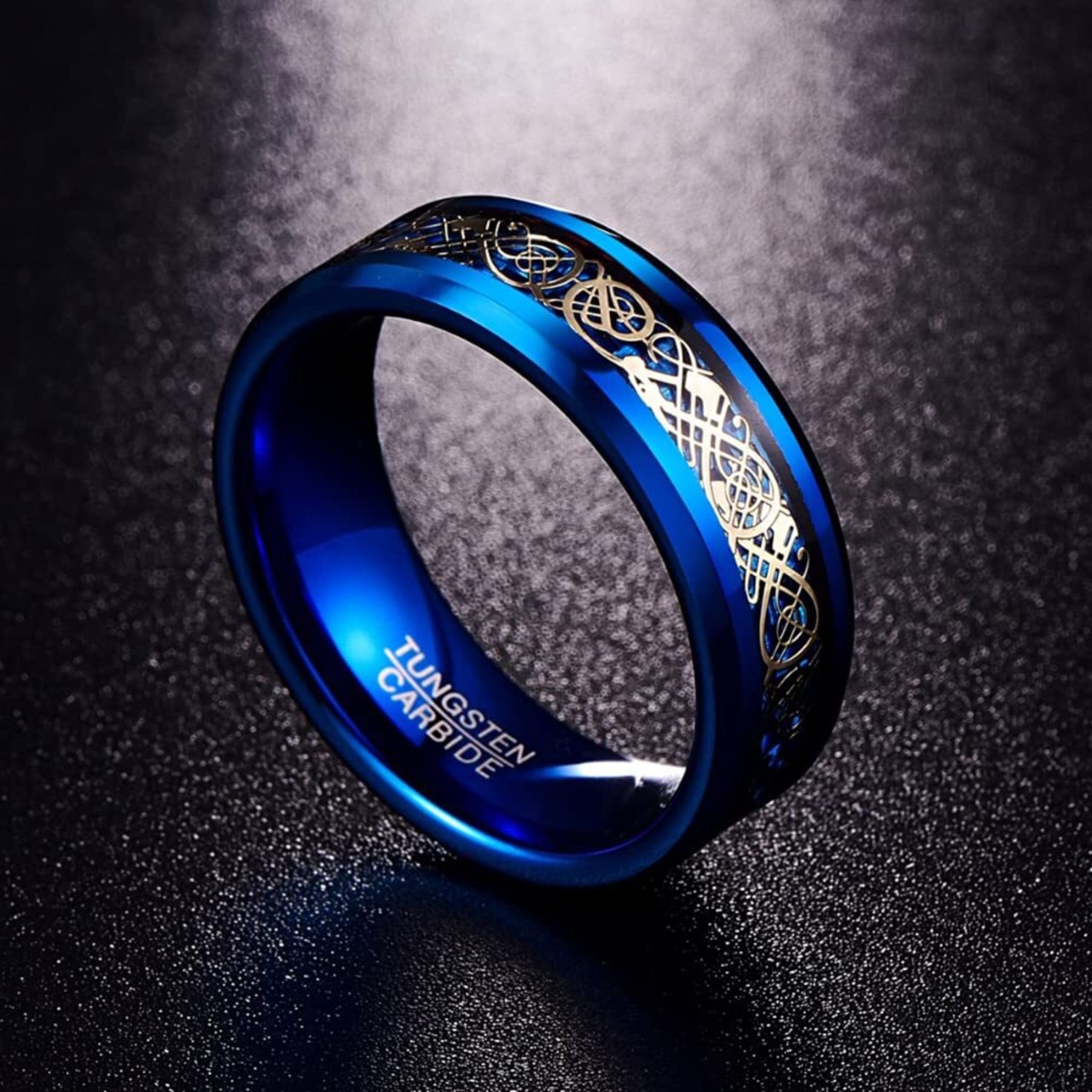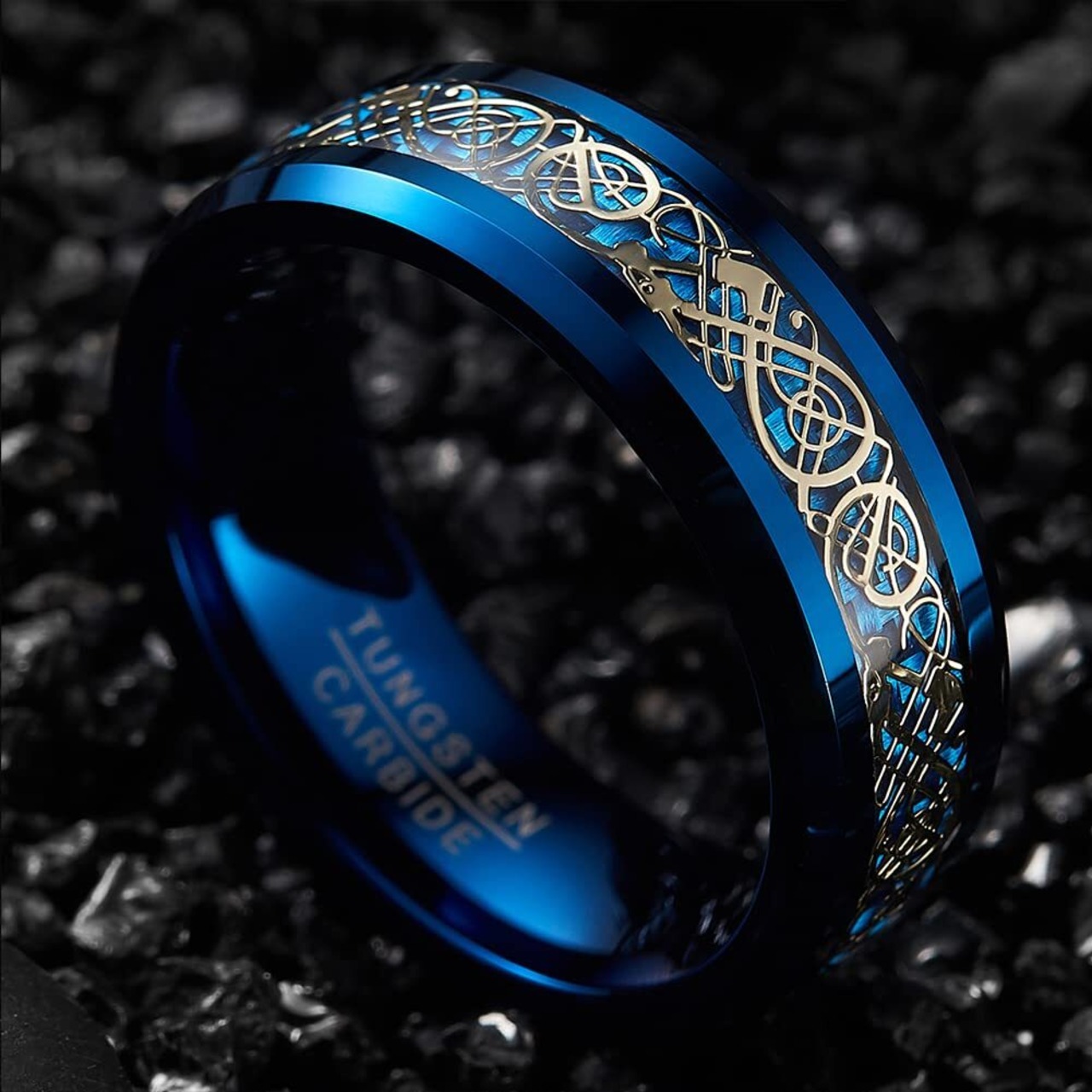 「Rockyu 指輪」 メンズ タングステン 炭素繊維 カーボンファイバー ドラゴンリング 竜紋指輪 耐久性 龍紋 青 8mm 16号(指周り:57mmに合う) 指輪 メンズ おしゃれ 指輪 タングステン比重:金とほぼ同じ、硬度:ダイヤモンドに匹敵