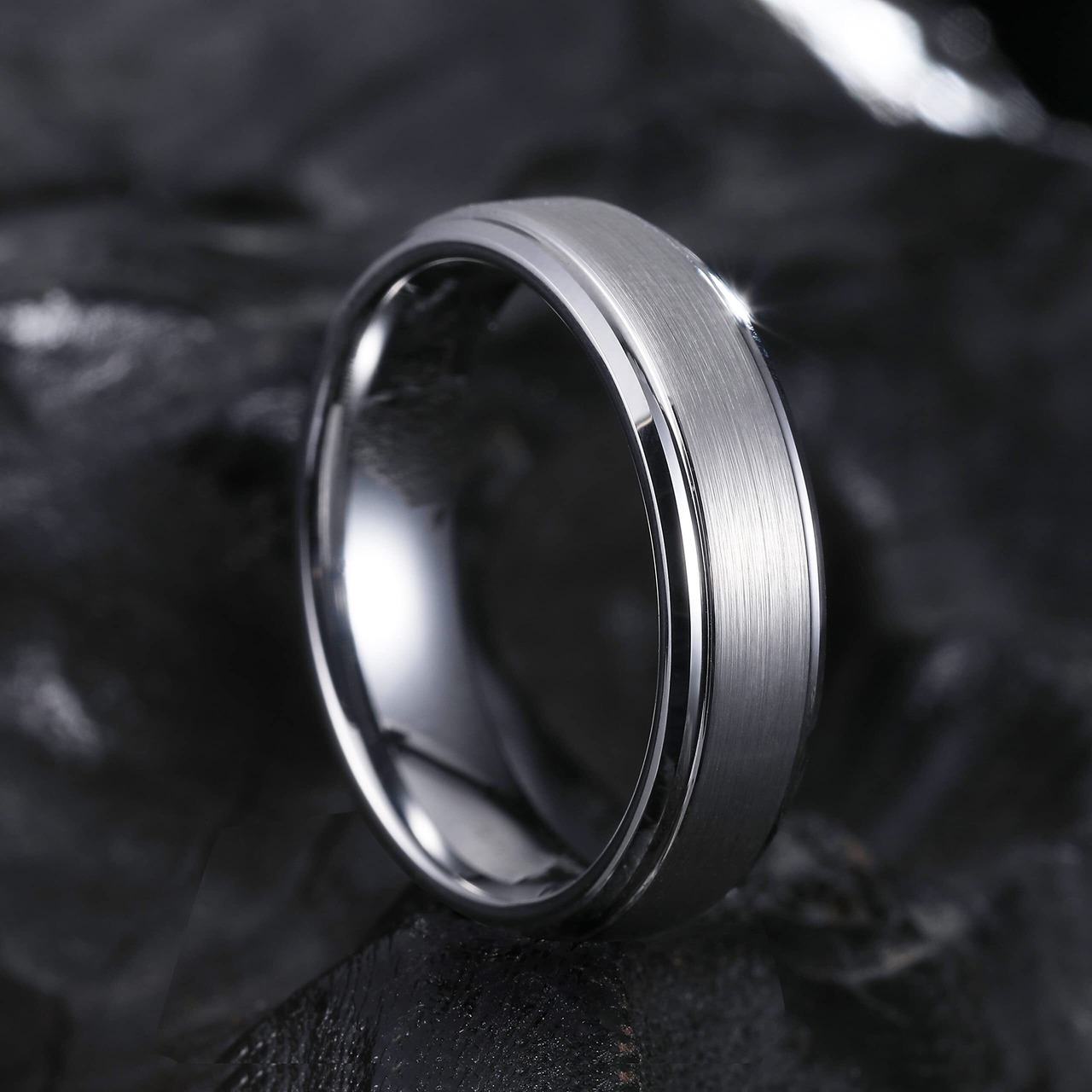 クラシックデザイン:6mm幅のタングステンリング。メンズ・レディース兼用で、ブラッシュ仕上げとベベルエッジ、高光沢の内側が特徴です。