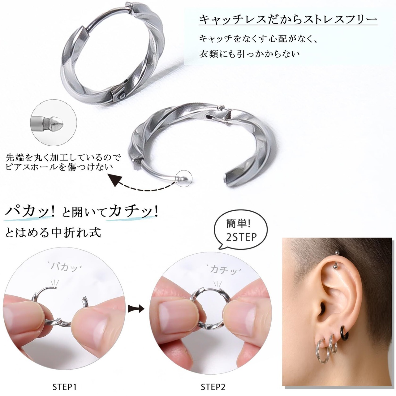 【簡単着脱の中折れ式】パカッ!と開いてカチッ!とはめる中折れ式を採用。キャッチレスなデザインのためキャッチをなくす心配もありません。フープピアスのポスト(針)は先端を丸く加工しているのでピアスホールに優しく、つけっぱなしでも問題ございません。