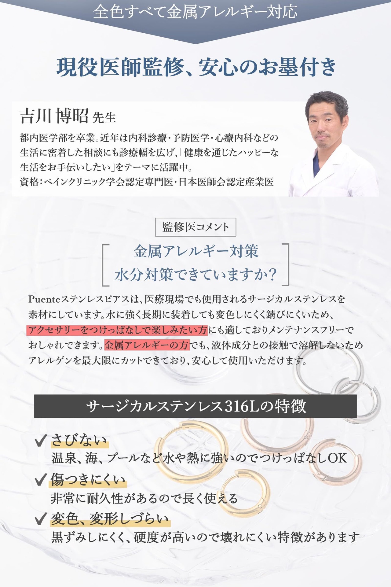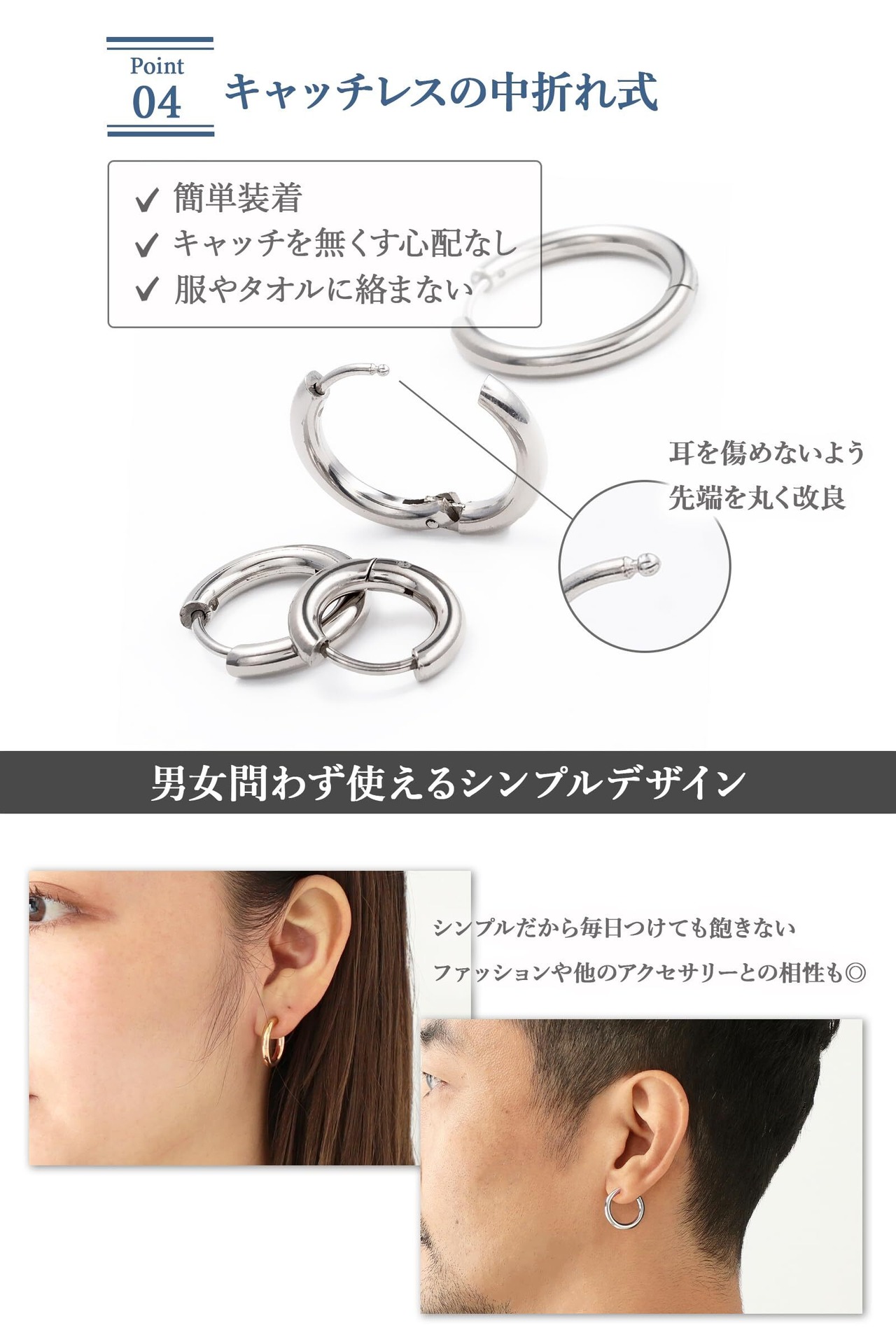 【どんなシーンにも合うシンプルなフープピアス】 ピアス初心者さんからおしゃれ上級者まで、誰でも使いやすいシンプルなデザインのフープピアスは、一つ持っておくと重宝します。 カジュアルなTシャツスタイルにも、キレイめなオフィスコーデにもマッチする万能ピアス。サイズ違いで揃えれば、重ね付けや気分に合わせたコーディネートも楽しめます。 キャッチレスな中折れ式のピアスなのでキャッチを失くす心配もなくストレスなく長時間つけっぱなしで着用可能です。