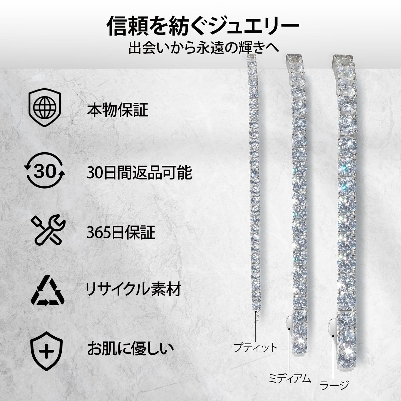 【手元を華やかに彩る】幅5mmの大粒ジルコニアを贅沢に配置した、シンプルでありながら存在感のあるテニスブレスレット。普段のスタイルにプラスするだけで寂しくなりがちな手元を上品に変えてくれます。男女問わず使えるデザインなので、ペアアクセサリーとしてもおすすめです。