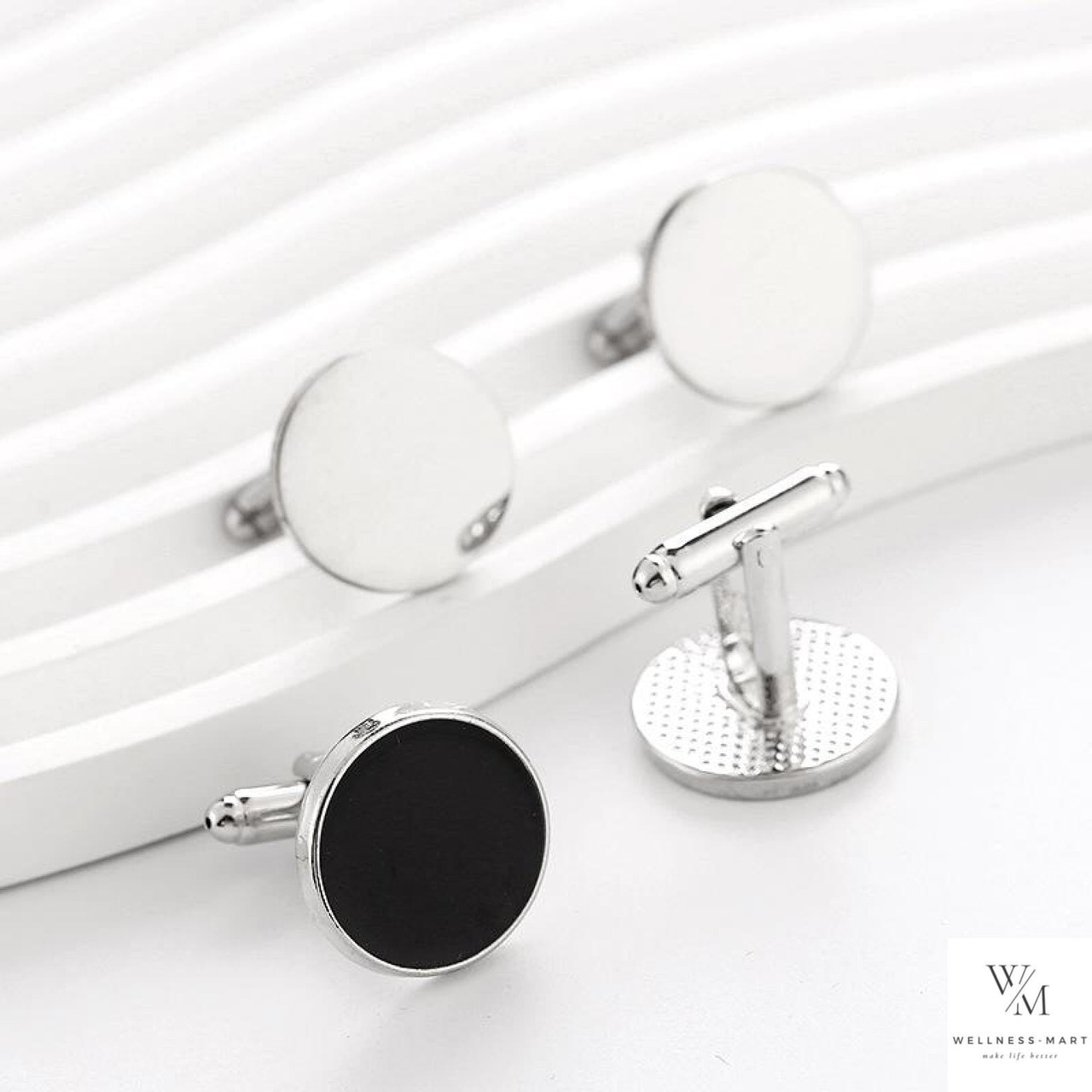デザイン: シンプルでエレガントな円形のカフスボタン、シルバーカラーのフレームに黒オニキスを配置したクラシカルなデザイン