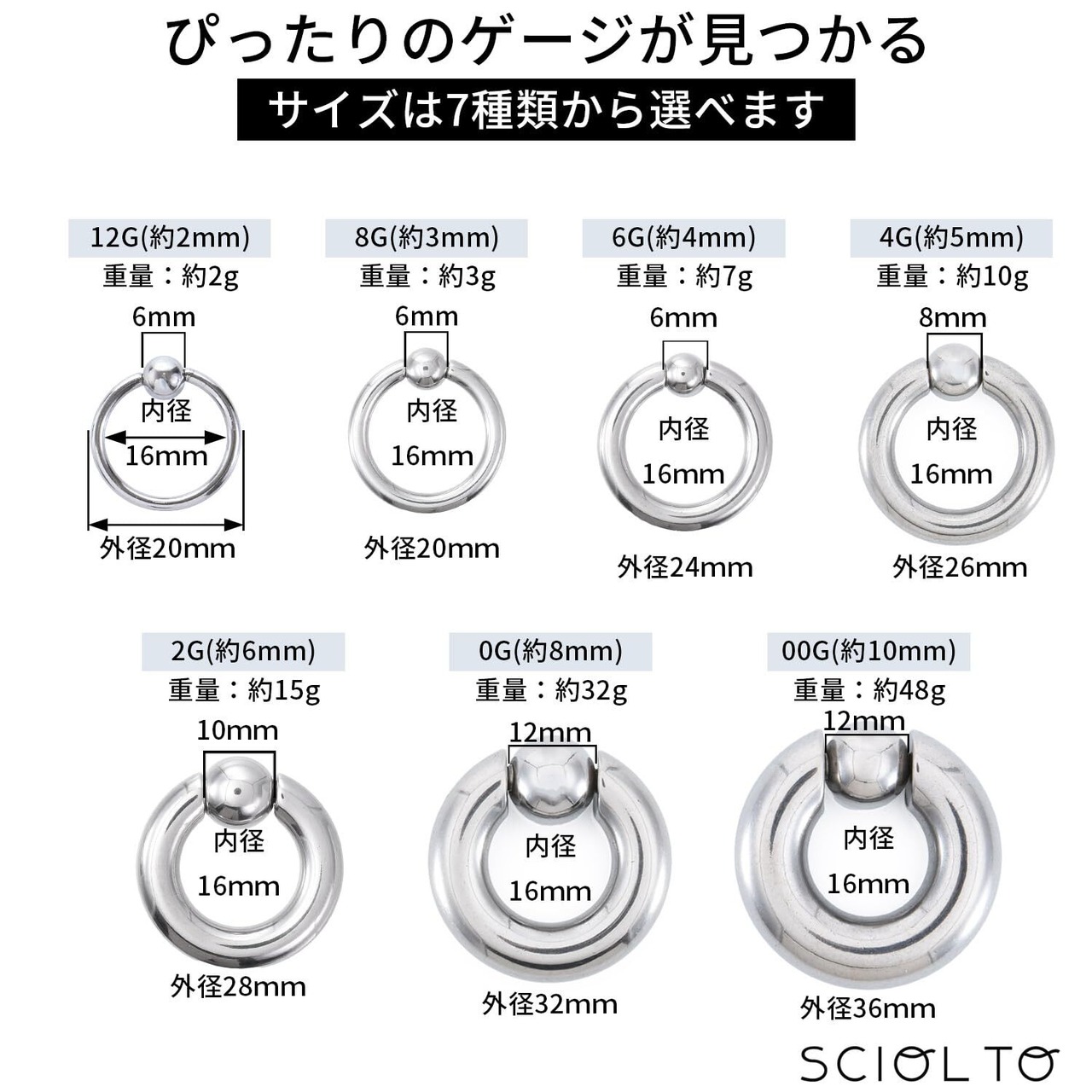 【サイズ】[12G](約3mm):外径20mm、内径16mm、重量約2g、ボールサイズ6mm [8G](約3mm):外径20mm、内径16mm、重量約3g、ボールサイズ6mm [6G](約4mm):外径24mm、内径16mm、重量約7g、ボールサイズ8mm [4G](約5mm):外径26mm、内径16mm、重量約10g、ボールサイズ8mm [2G](約6mm):外径28mm、内径16mm、重量約15g、ボールサイズ8mm [0G](約8mm):外径32mm、内径16mm、重量約32g、ボールサイズ12mm [00G](約10mm):外径36mm、内径16mm、重量約48g、ボールサイズ12mm