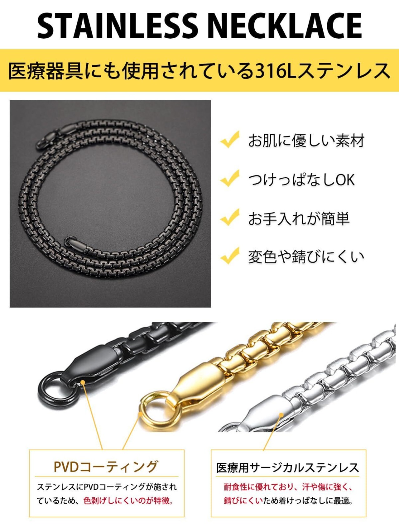 【ステンレスネックレス】地金はステンレスを採用。「錆びにくい」「アレルギー反応を起こしにくい」ので、お肌に優しい素材として人気です。