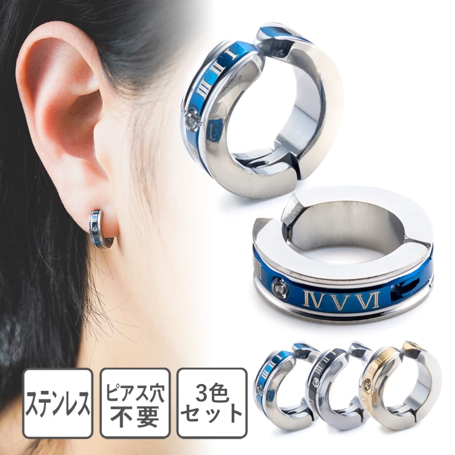 [Puente] フェイクピアス メンズ レディース ステンレス イヤリング フープイヤリング 両耳セット ローマ数字 フープ リング ノンホールピアス
