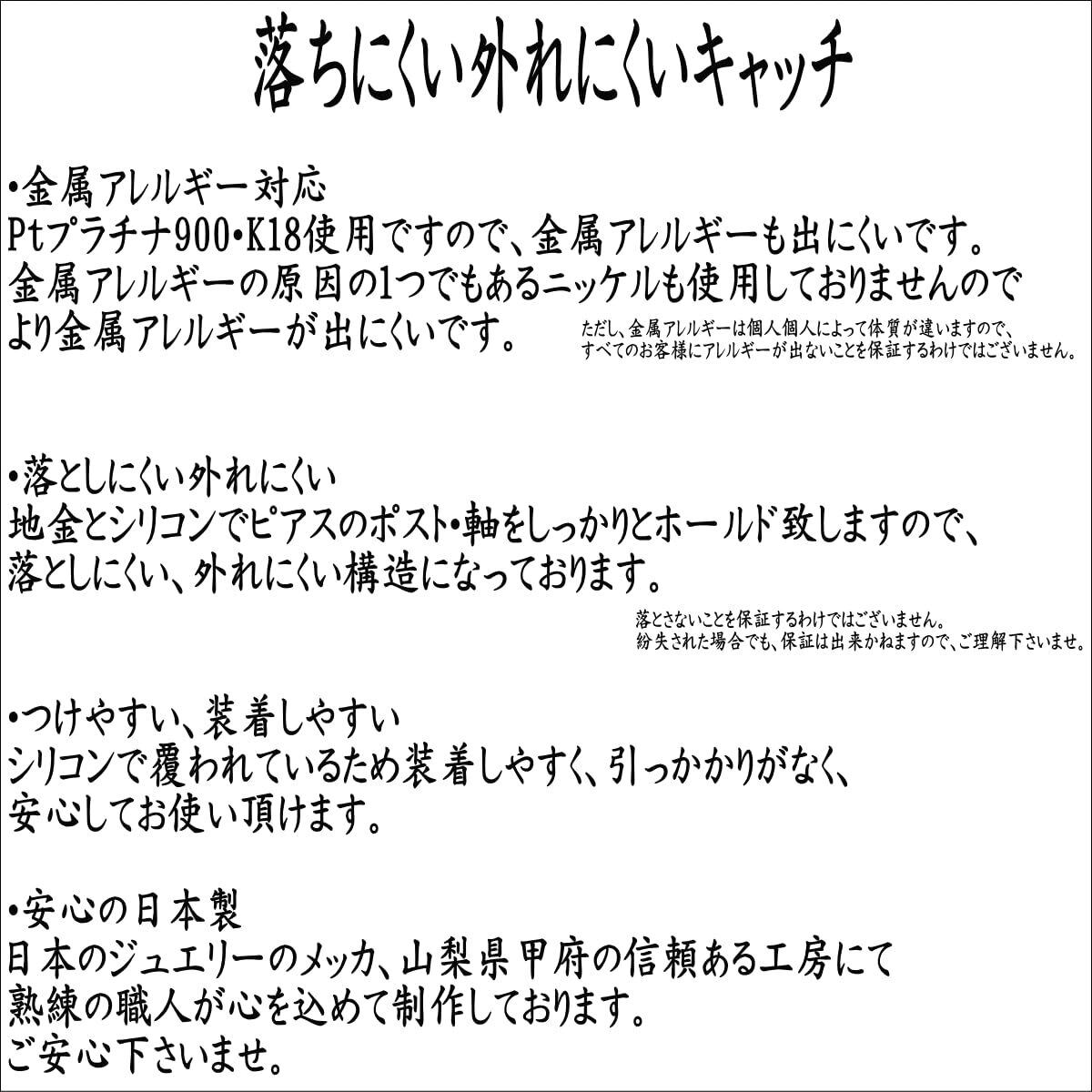 上質なK18のピンクゴールドの素材を使用しておりますので、金属アレルギーを起こしにくいです。皮膚にやさしい透明なシリコンで地金のキャッチを包んだダブルロック式のキャッチです。
