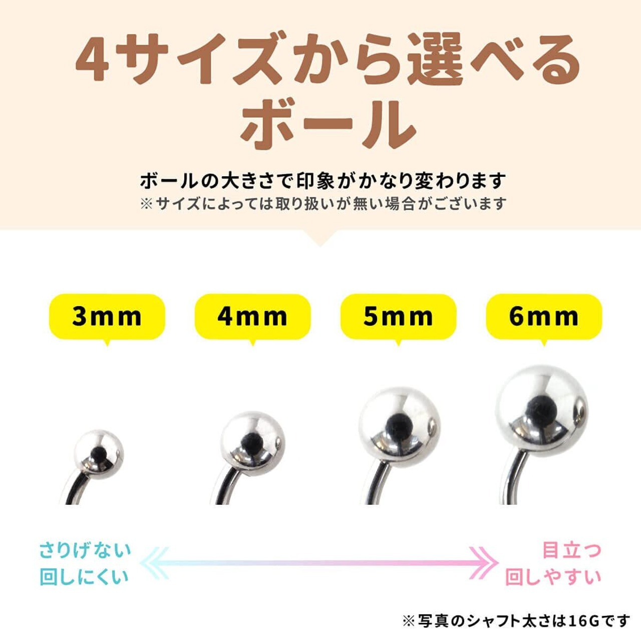 太さ14G,16G,18G シャフト6mm〜18mm ボール2mm〜6mmのバナナバーベルです