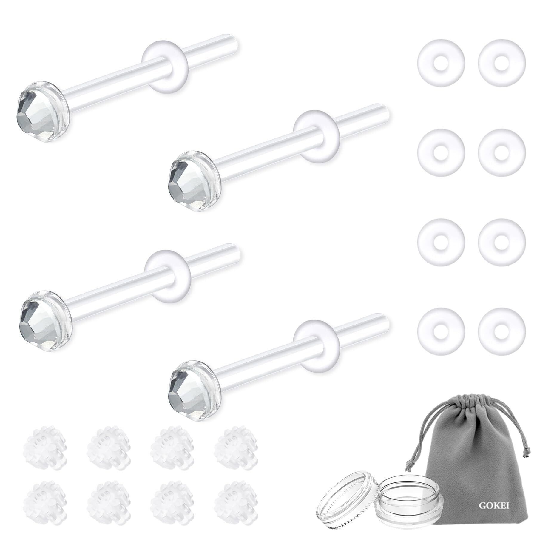 [GOKEI] ガラスピアス 透明ピアス 強化ガラス ピアス レディース 【4本ピアス+16個キャッチ】 14G 16G 18G 20G 金属アレルギー対応 軟骨ピアス ボディピアス つけっぱなし ガラス ピアッサー 透明 肌になじむ 軟骨 へそピアス キャッチ 両耳用