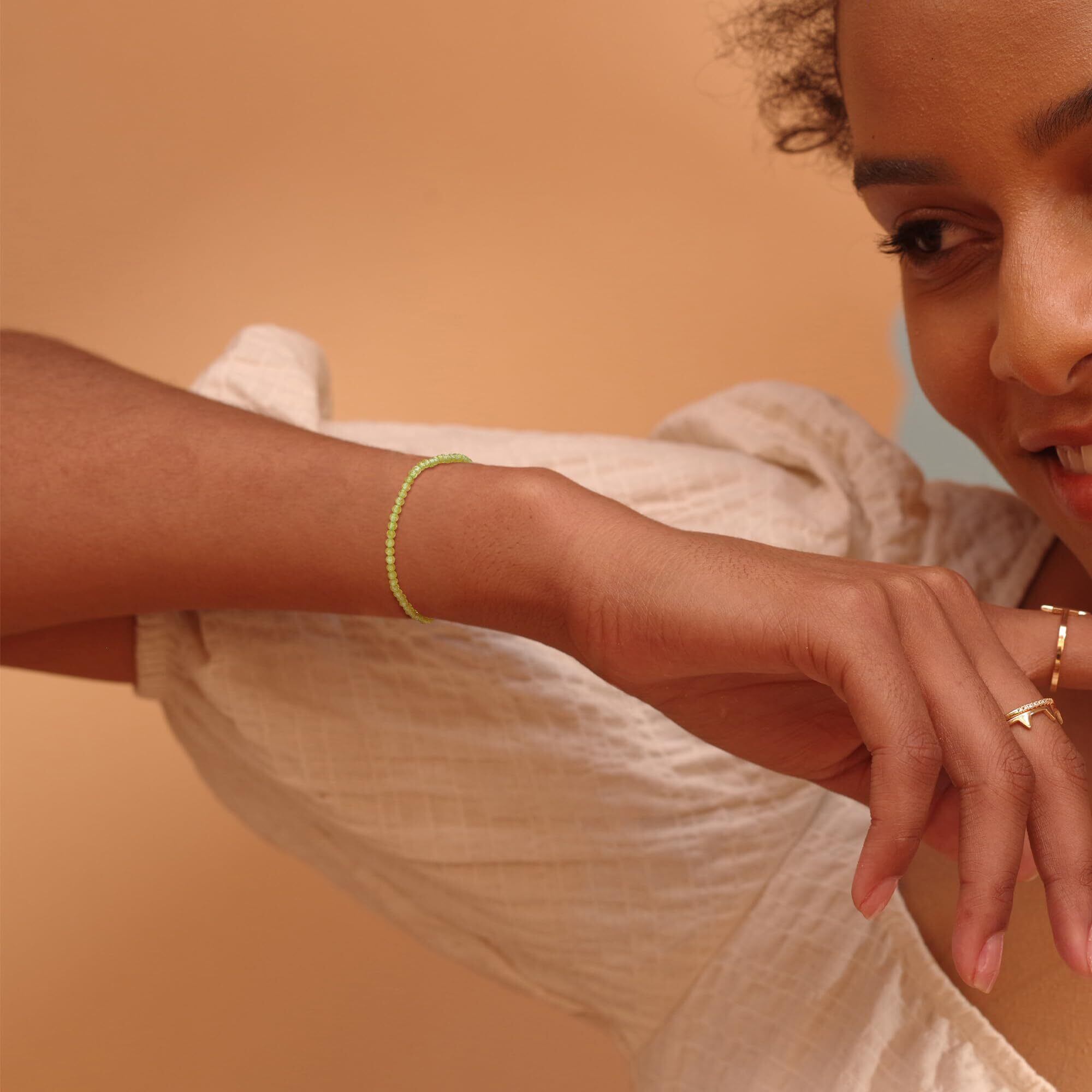 【美しいペリドットビーズ】 鮮やかなグリーンが特徴のペリドットビーズを使用し、癒しと幸福をもたらすとされるパワーストーンで、洗練された輝きを放つブレスレットです。