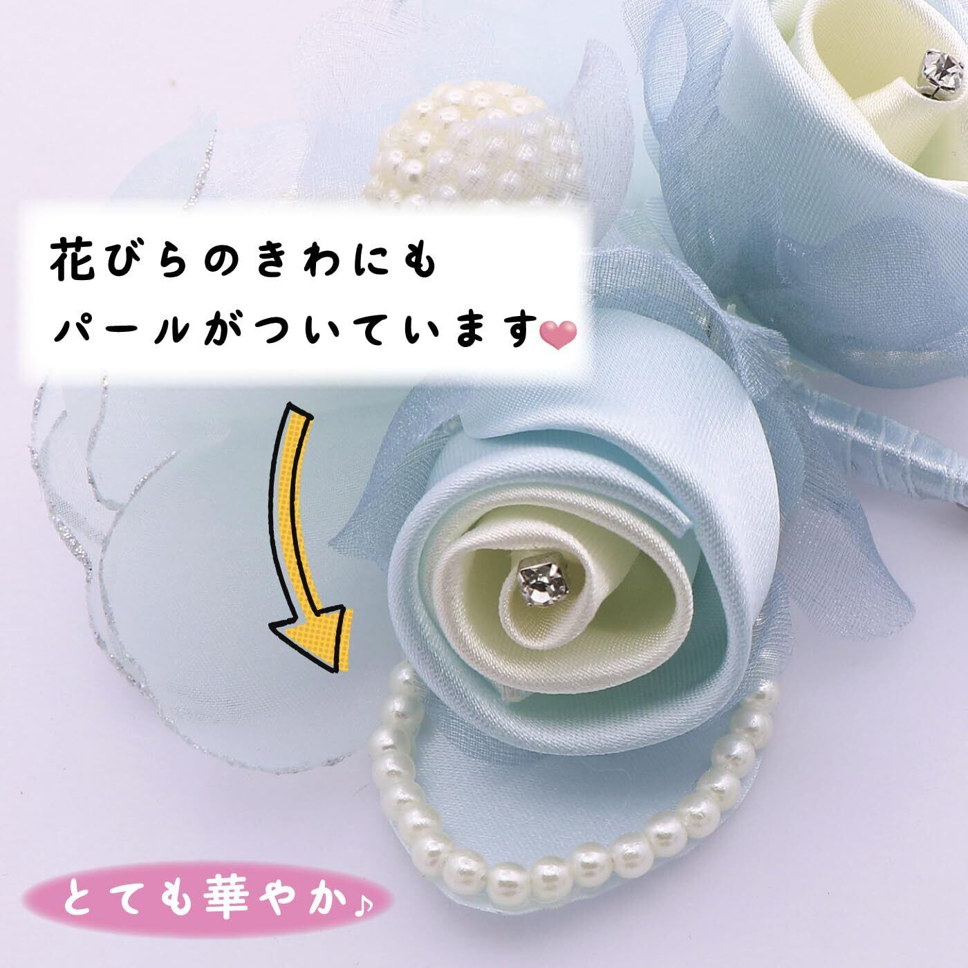 ■パールボールが可愛らしさを演出:2個のパールボールが特徴的な可愛らしいコサージュです。さらに花びらの縁にパールやシルバーラメを演出し、ゴージャスに仕上がりました。