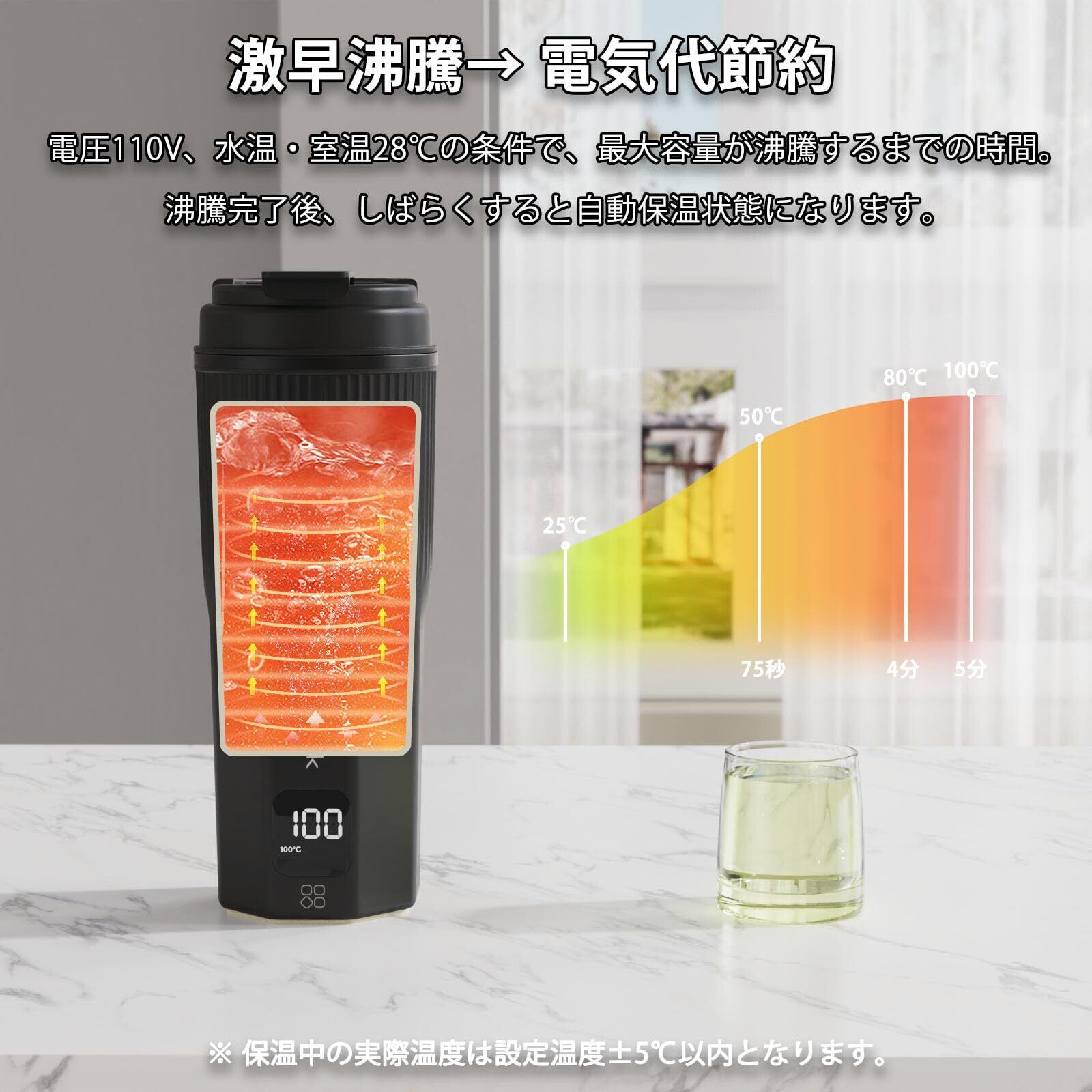 【お好みのお飲み物に合わせた温度調節機能】当社のポータブル電気ケトルは、6段階(45℃~100℃)の温度調節が可能で、日本茶は70℃で香りを引き立て、粉ミルクの調乳に最適な45℃まで細かく調整可能です。忙しい朝でも、12時間の保温機能でいつまでも温かい状態を維持。オフィスでの作業中や深夜のリラックスタイムに、理想の温度で飲み物をお楽しみいただけます。