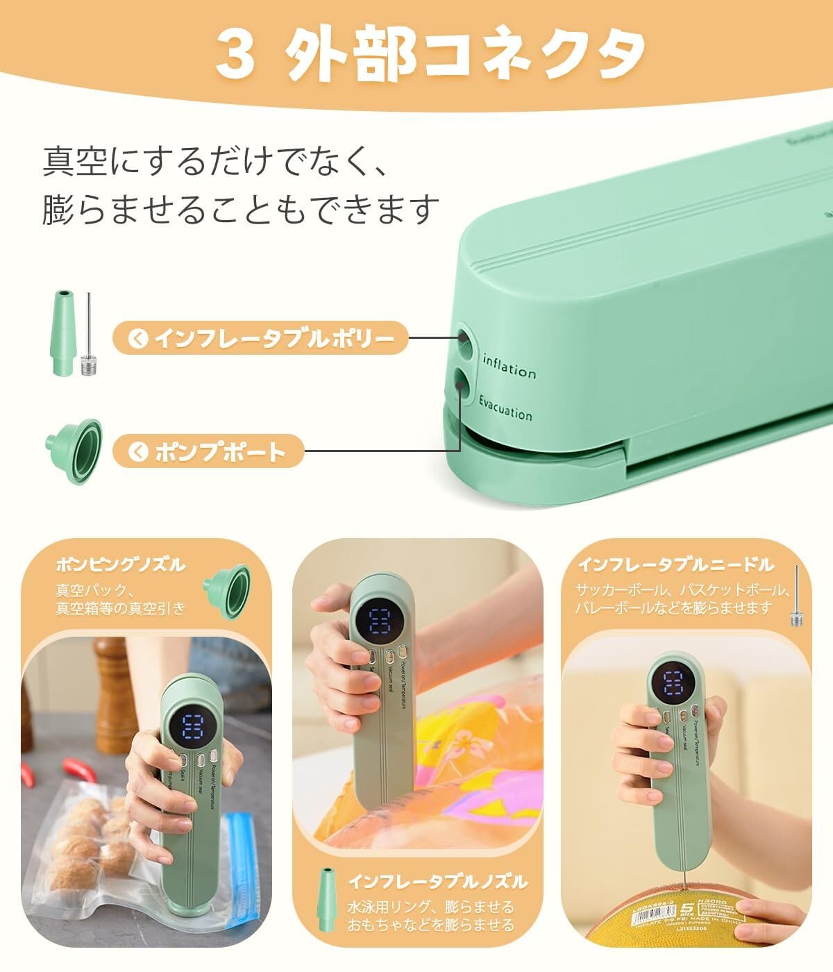 【マルチ機能ノズル付き】真空パック 機 外部ノズル(真空用/膨張用)を標準装備。真空ノズルは貯蔵タンクやワインボトルなどを真空にするのに使用され、スポーツボールの空気入れにも対応。長期保存から日常メンテナンスまで、家庭で役立つ多機能デザインです