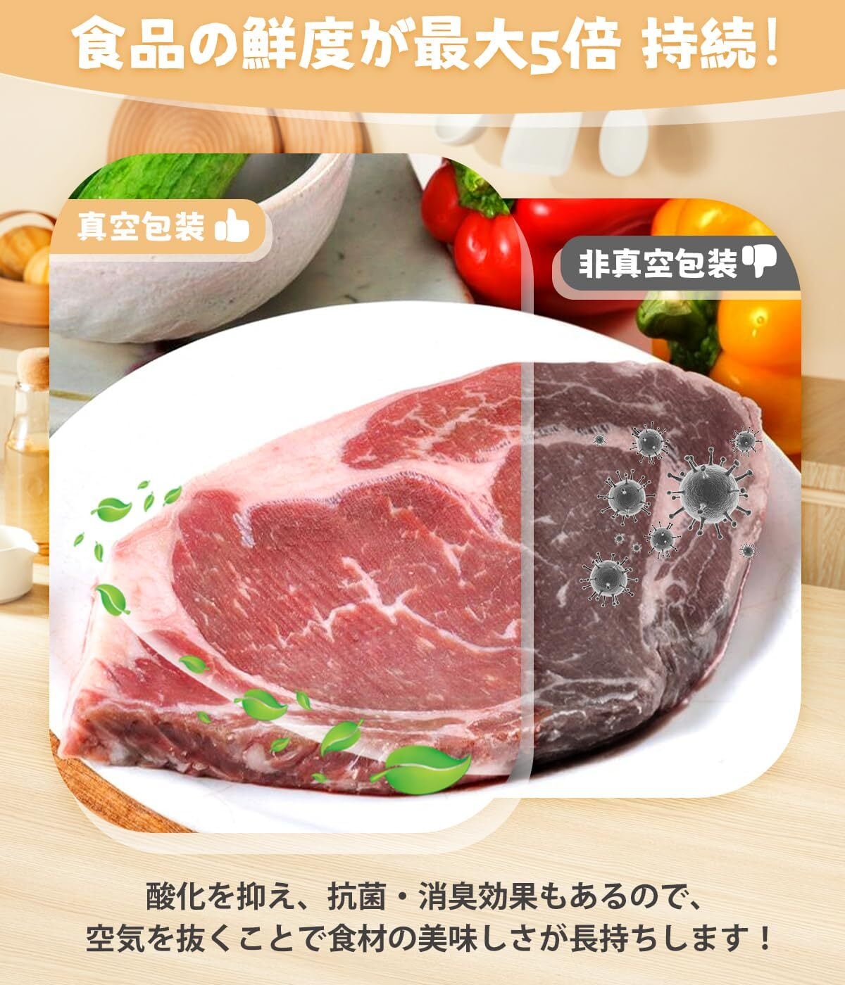 【食品を新鮮に保つ】この2025食品真空シーラーのアップグレード版は強力60kPaな吸引力を備えています。高度なシーリング技術により、真空バッグから空気を取り除き、食品の栄養価と水分を保ちます。保存期間を最大5倍延長でき、日常の家族、キャンプ愛好家、食品保管のニーズ、小規模なケータリングなどに最適です